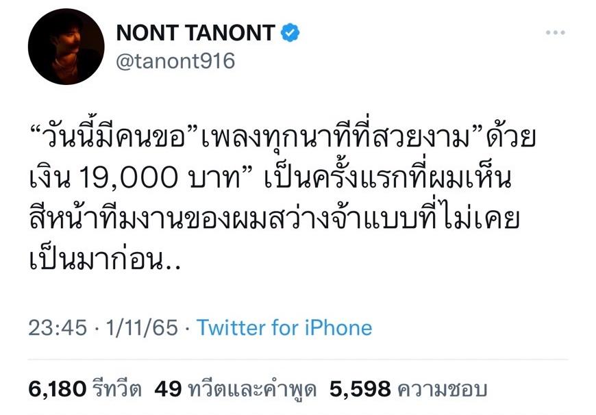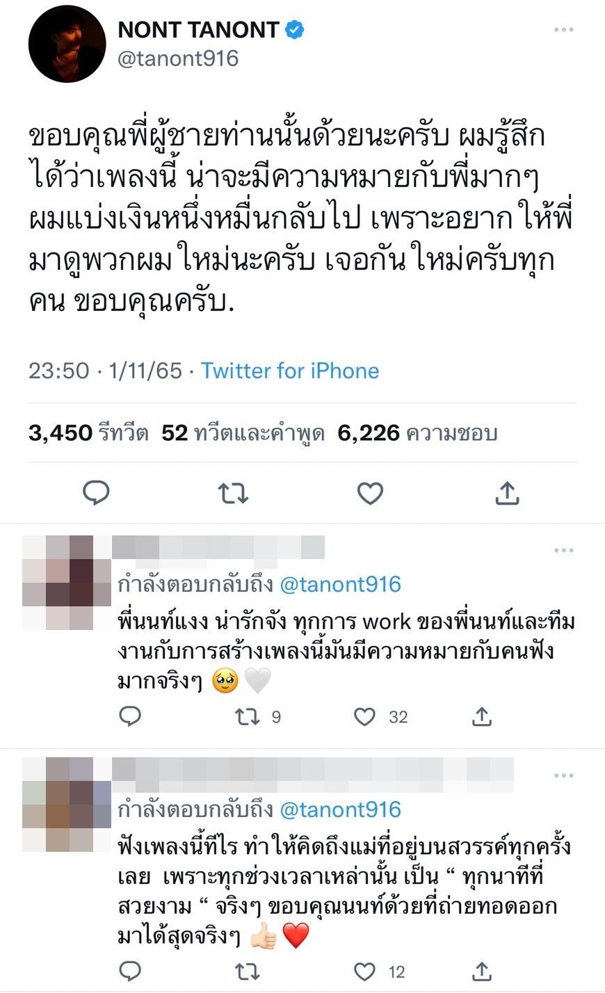 โดย นนท์ ธนนท์ ทวีตข้อความเล่าเหตุการณ์ดังกล่าวผ่านทางทวิตเตอร์ @tanont916 ไว้ว่า “วันนี้มีคนขอเพลง “ทุกนาทีที่สวยงาม” ด้วยเงิน 19,000 บาท เป็นครั้งแรกที่ผมเห็นสีหน้าทีมงานของผมสว่างจ้าแบบที่ไม่เคยเป็นมาก่อน..” ก่อนจะเล่าต่อไปว่า “ขอบคุณพี่ผู้ชายท่านนั้นด้วยนะครับ ผมรู้สึกได้ว่าเพลงนี้ น่าจะมีความหมายกับพี่มากๆ ผมแบ่งเงินหนึ่งหมื่นกลับไป เพราะอยากให้พี่มาดูพวกผมใหม่นะครับ เจอกันใหม่ครับทุกคน ขอบคุณครับ.”