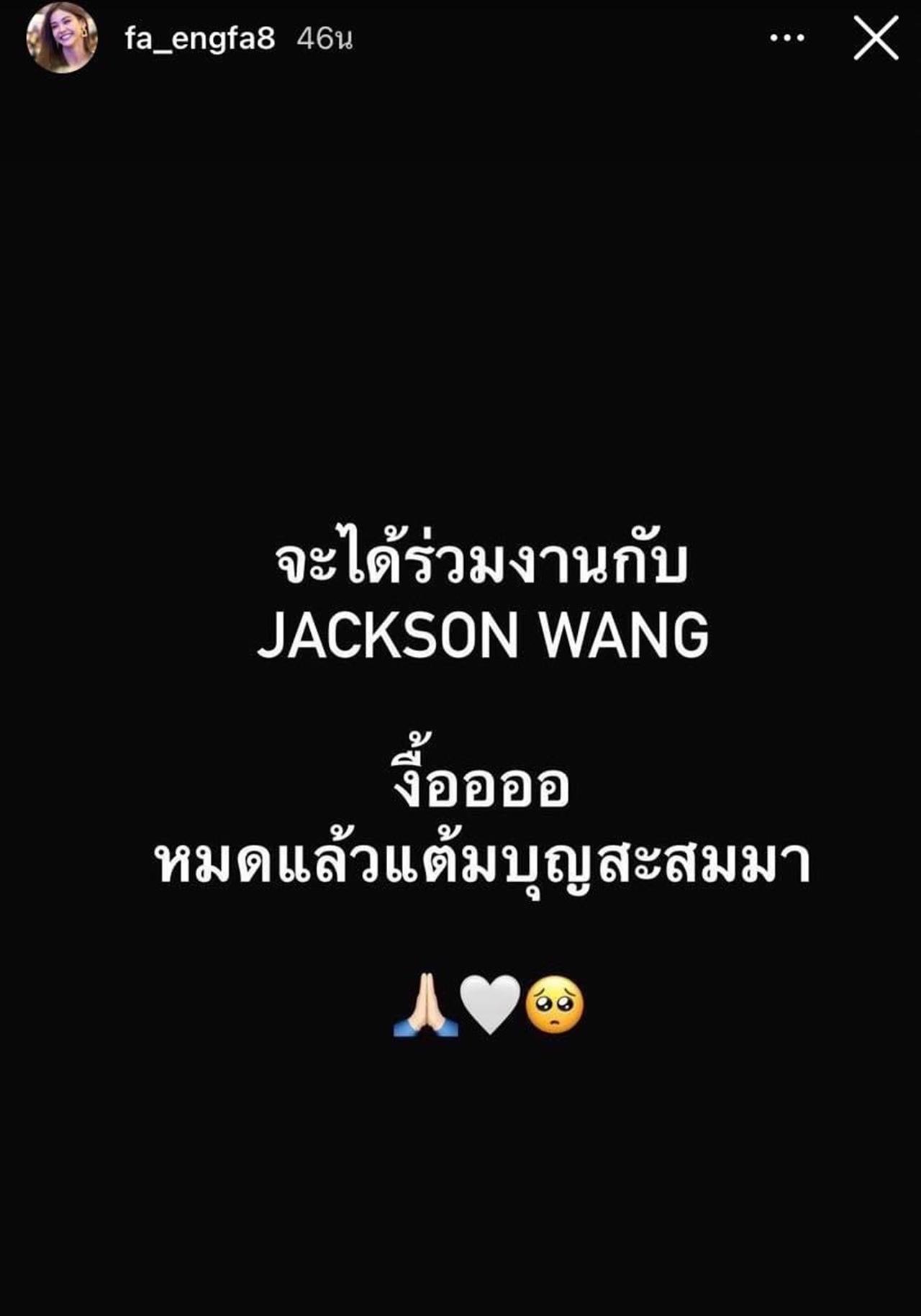 โดยล่าสุด อิงฟ้า ได้โพสต์ไอจีสตอรี่ที่เขียนข้อความว่า "จะได้ร่วมงานกับ JACKSON WANG งื้ออออ หมดแล้วแต้มบุญสะสมมา"