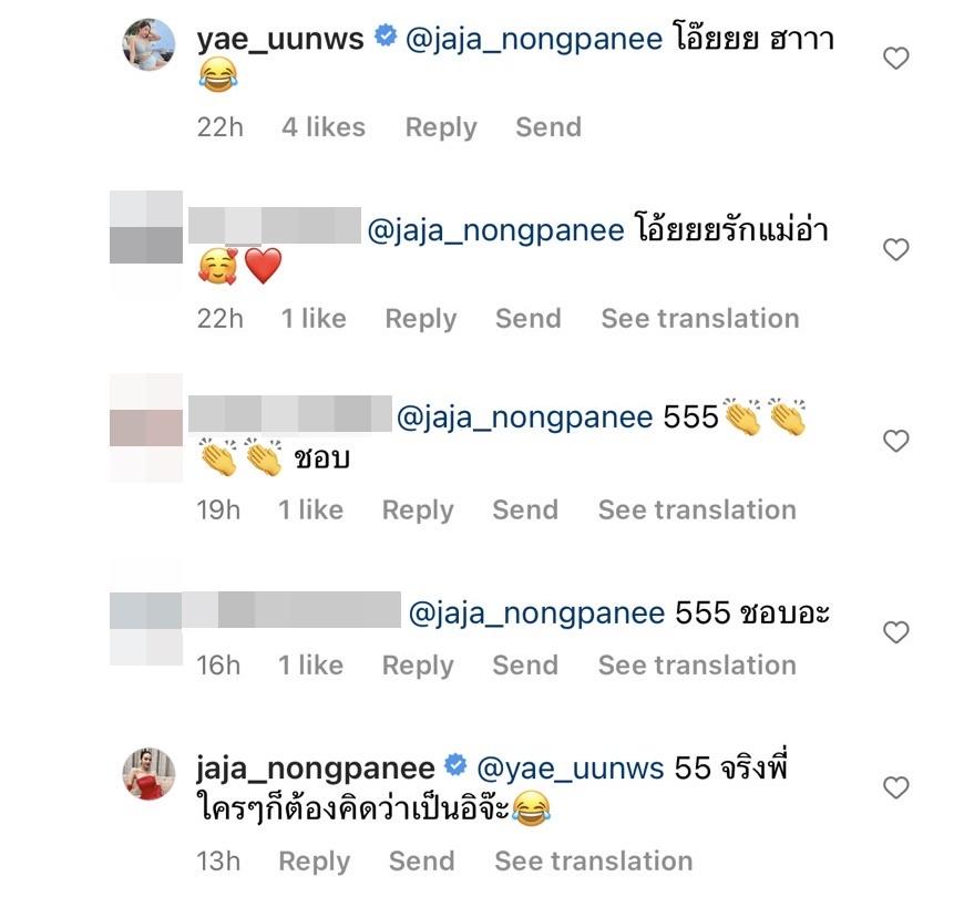 ด้านคนในวงการ หญิงแย้ นนทพร ก็คอมเมนต์ถึงจ๊ะว่า “โอ๊ยยย ฮาาา” ก่อนที่จ๊ะจะตอบกลับว่า “55 จริงพี่ ใครๆ ก็ต้องคิดว่าเป็นอิจ๊ะ” ด้วย.