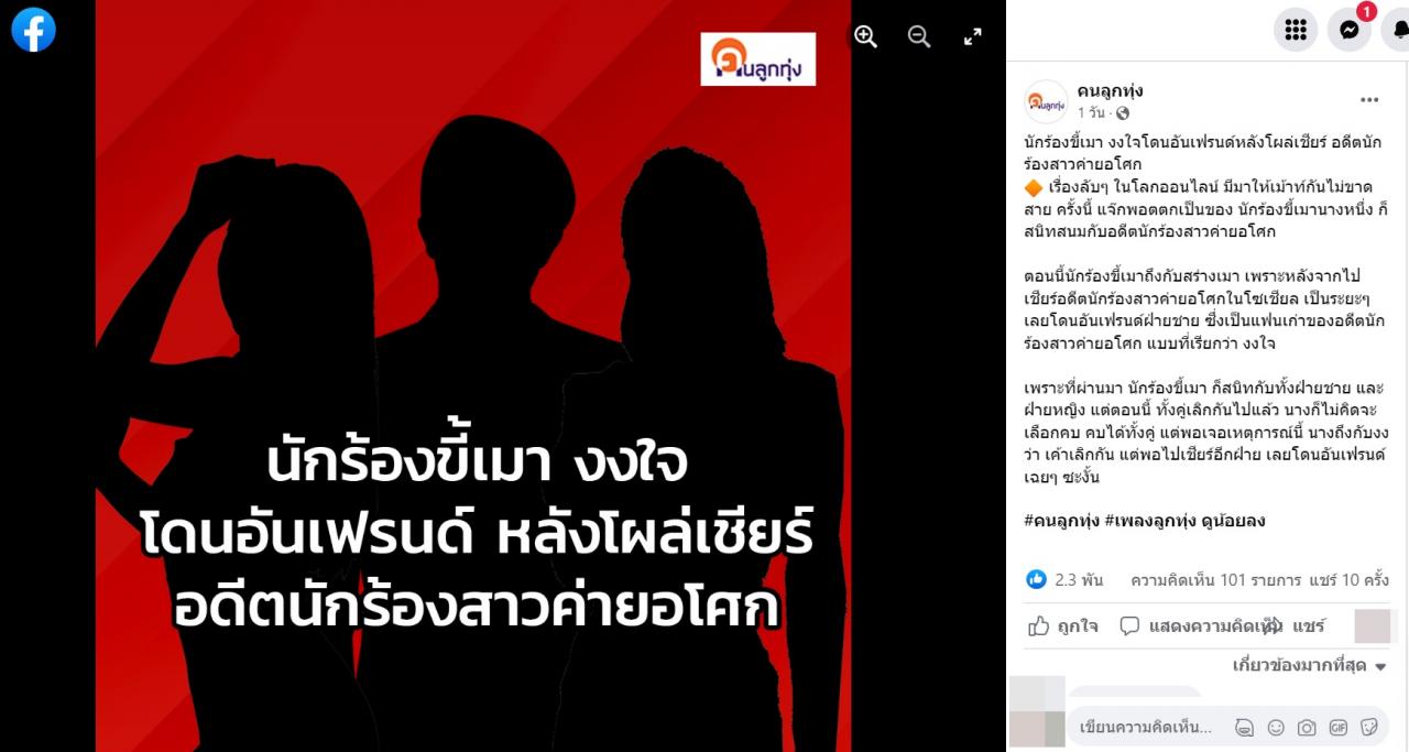 หลังจากเพจ คนลูกทุ่ง โพสต์ข่าวเม้าท์ถึงนักร้องขี้เมา งงใจโดนอันเฟรนด์ หลังโผล่เชียร์อดีตนักร้องสาวค่ายอโศก โดยบอกว่า “เรื่องลับๆ ในโลกออนไลน์ มีมาให้เม้าท์กันไม่ขาดสาย ครั้งนี้ แจ๊กพอตตกเป็นของ นักร้องขี้เมานางหนึ่ง ก็สนิทสนมกับอดีตนักร้องสาวค่ายอโศก