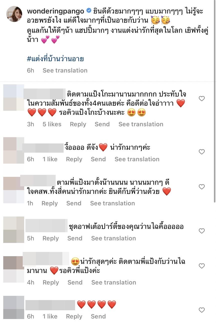 ท่ามกลางคอมเมนต์แสดงความยินดีจากชาวเน็ต บ้างก็คอมเมนต์แสดงความชื่นชมในมิตรภาพ อาทิ ติดตามแป้งโกะมานานมากกกก ประทับใจในความสัมพันธ์ของทั้ง 4 คนเลยค่ะ คือดีต่อใจอ่าาาา รอคิวแป้งโกะบ้างนะคะ, ตามพี่แป้งมาตั้งน๊านนนน นานนมากๆ ดีใจ คสพ.ทั้งสี่คนน่ารักมากค่ะ ยินดีกับพี่ว่านด้วย, งื้ออออ ดีจัง น่ารักมากๆ ค่ะ, คือดีย์กับความสัมพันธ์นี้, น่ารักสุดๆ ค่ะ ติดตามพี่แป้งกับว่านไฉมานาน รอคิวพี่แป้งค่ะ ฯลฯ.