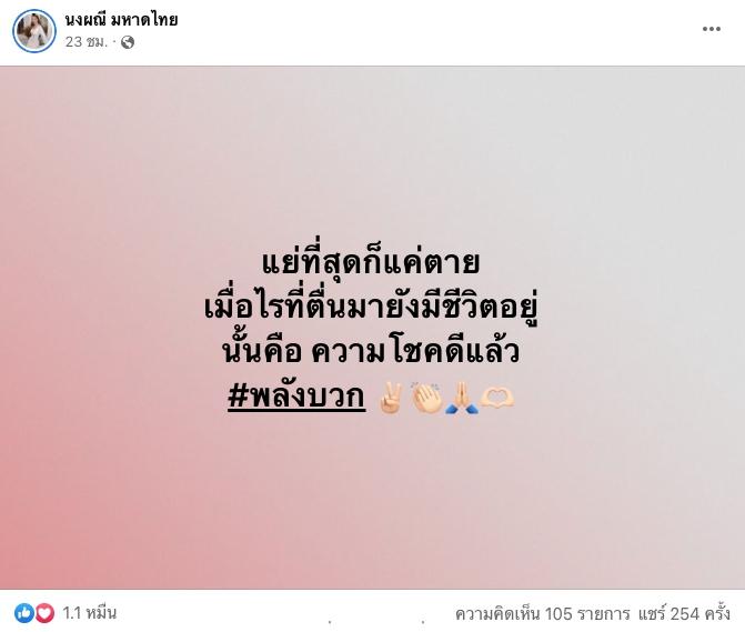 แต่ล่าสุดทำเอาแฟนคลับหลายคนต่างเข้าไปให้กำลังใจเธอรัวๆ ที่เห็นสาว จ๊ะ นงผณี นั้นออกมาโพสต์แคปชั่นสั้นๆ แต่มีความหมายที่ดีมาก ลงบนเฟซบุ๊กส่วนตัว โดยระบุข้อความดังกล่าวว่า "แย่ที่สุดก็แค่ตาย เมื่อไรที่ตื่นมายังมีชีวิตอยู่นั้นคือ ความโชคดีแล้ว #พลังบวก"