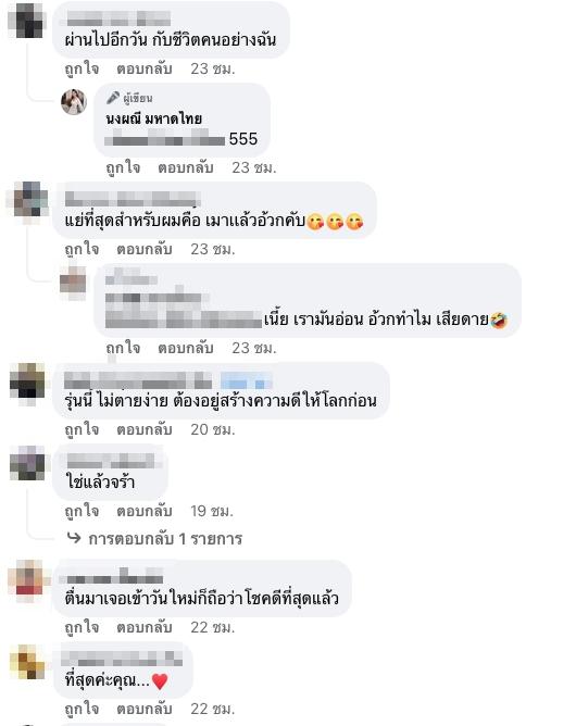 พร้อมกับคอมเมนต์เป็นจำนวนมาก เช่น "ผ่านไปอีกวัน กับชีวิตคนอย่างฉัน, แย่ที่สุดสำหรับผมคือ เมาเเล้วอ้วกคับ, รุ่นนี้ ไม่ตายง่าย ต้องอยู่สร้างความดีให้โลกก่อน, ตื่นมาเจอเข้าวันใหม่ก็ถือว่าโชคดีที่สุดแล้ว, รู้สึกดีขึ้นมาทันทีเลย, ขอบคุณพลังบวกนะคะพี่, โดนใจจ้า" เป็นต้น.