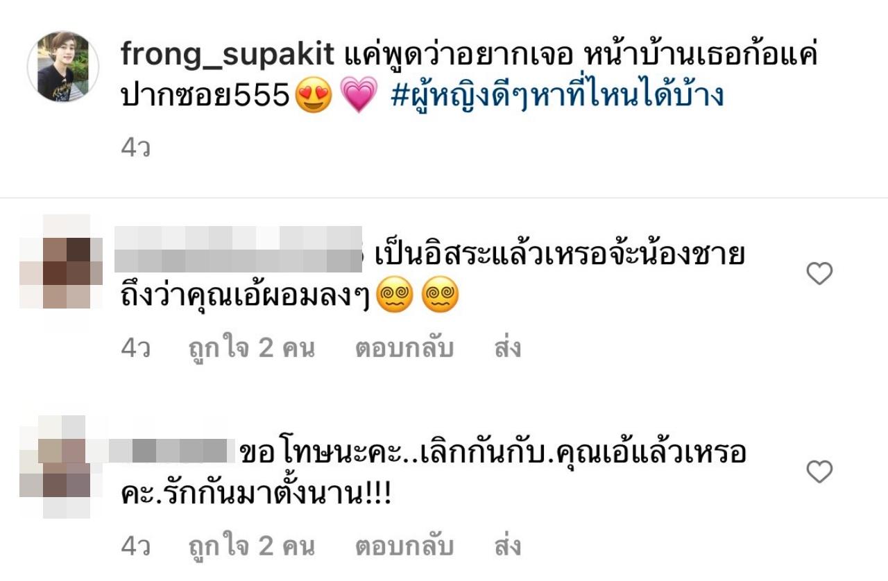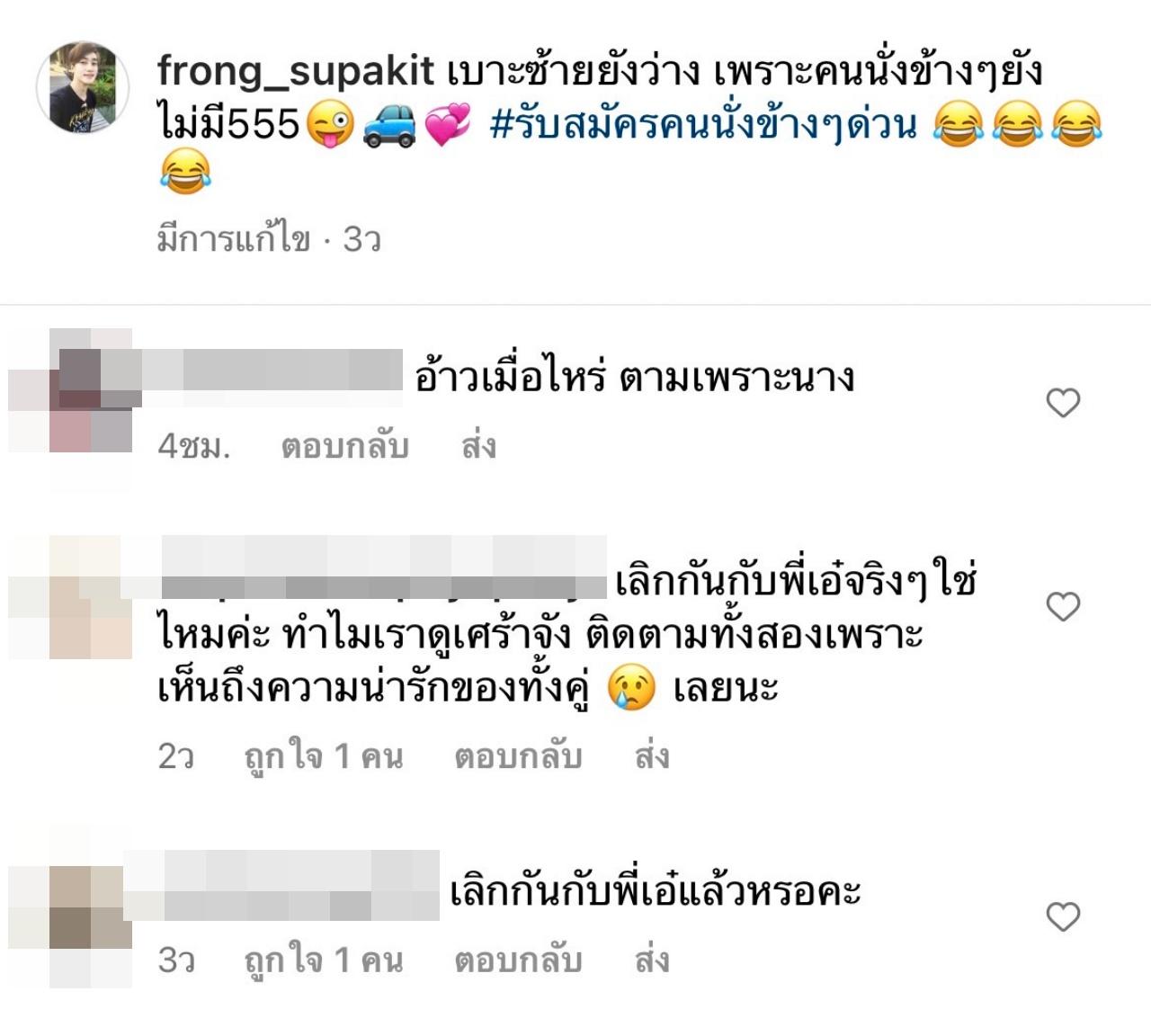 แม้จะถูกคอมเมนต์ถามถึงความสัมพันธ์ว่ายังรักกันดีหรือว่าเลิกกันไป แต่ทั้ง เอ้ และ ฟร้อง ก็ไม่ได้คอมเมนต์ตอบกลับชาวเน็ตที่ถามแต่อย่างใด งานนี้คงต้องรอฟังคำตอบจากปากของทั้งคู่น่าจะชัวร์ที่สุด.