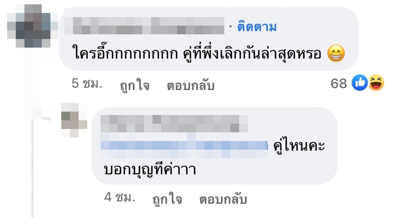 หลังจากที่เพจดังกล่าวได้โพสต์ข้อความไป ก็มีชาวเน็ตเข้ามาคอมเมนต์เดากันมากมายว่าอดีตคู่รักดาราคู่ไหนที่เข้าข่ายน่าจะเป็นคู่ที่เพจดังพูดถึงมากที่สุด ซึ่งแต่ละคนก็เข้ามาคอมเมนต์ว่า