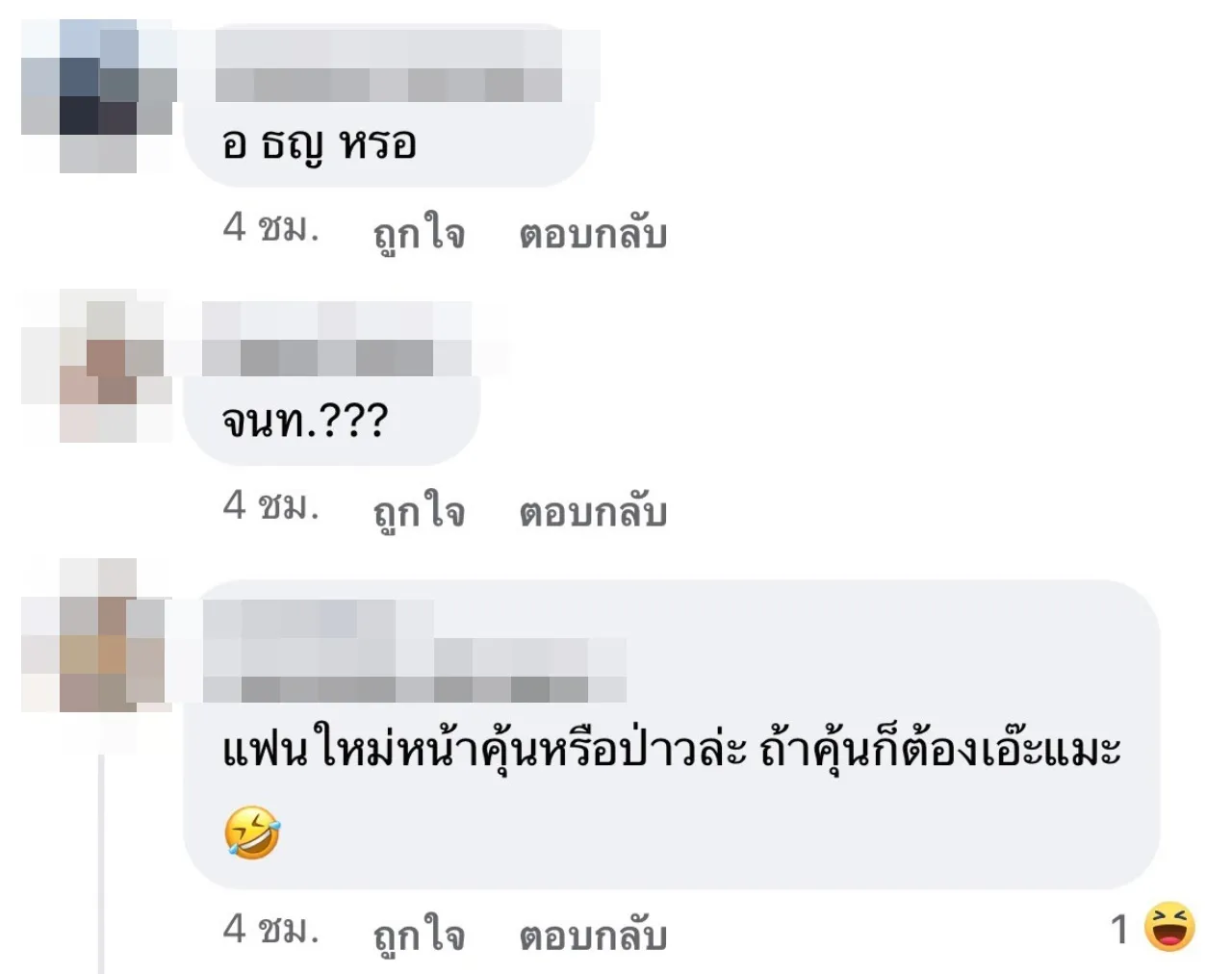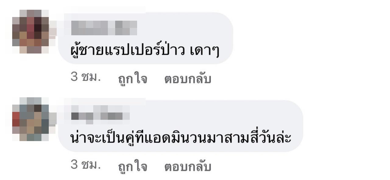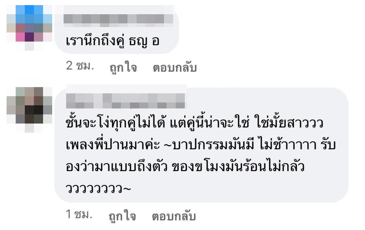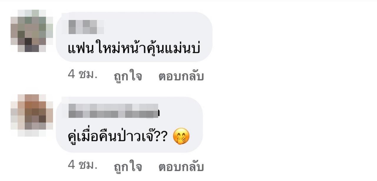 "ใครอี๊ก คู่ที่เพิ่งเลิกกันล่าสุดหรอ, คู่ของเล่นรึเปล่า, แฟนใหม่หน้าคุ้นแม่นบ่, เรานึกถึงคู่ ธญ อ, ผู้ชายแรปเปอร์ป่าว เดาๆ, คู่ที่ผู้เพิ่งไปวัดมาอะเหรอเจ๊, จนท."