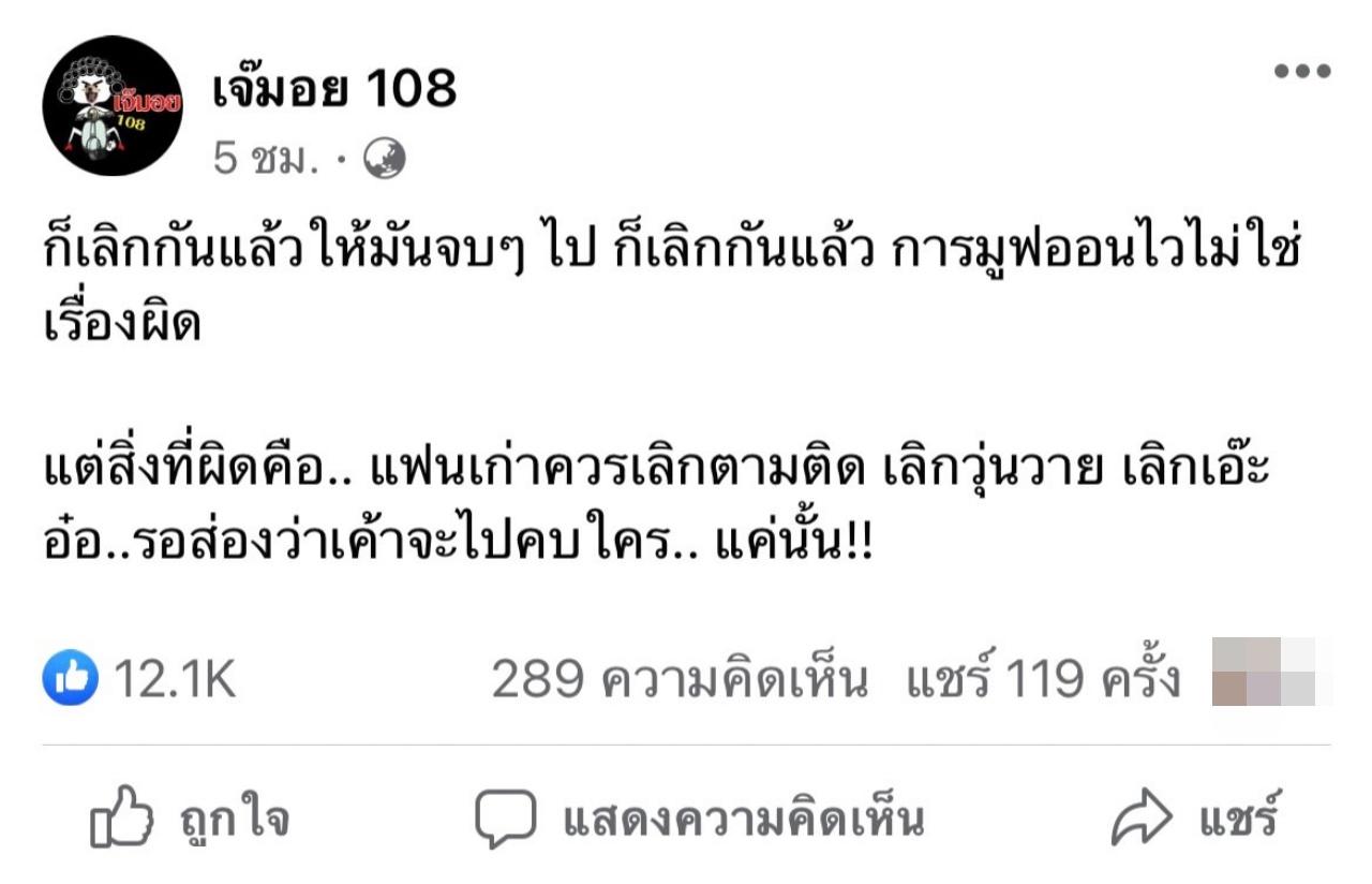 ไม่เป็นอันทำงานกันเลยทีเดียว เมื่อเพจดัง เจ๊มอย 108 ได้ออกมาโพสต์ข้อความหน้าเพจ โดยพูดถึงอดีตคู่รักคู่หนึ่งว่า "ก็เลิกกันแล้วให้มันจบๆ ไป ก็เลิกกันแล้ว การมูฟออนไวไม่ใช่เรื่องผิด แต่สิ่งที่ผิดคือ.. แฟนเก่าควรเลิกตามติด เลิกวุ่นวาย เลิกเอ๊ะ อ๋อ..รอส่องว่าเค้าจะไปคบใคร.. แค่นั้น!!"