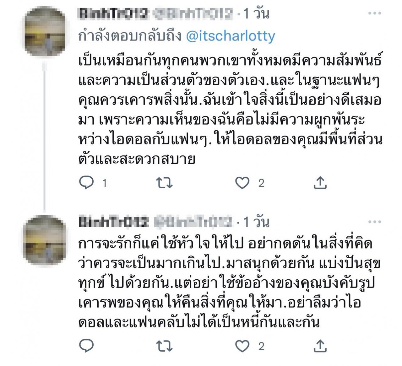 งานนี้ทำเอาแฟนคลับเข้ามาแสดงความเห็นเป็นจำนวนมาก เช่น "เป็นเหมือนกันทุกคนพวกเขาทั้งหมดมีความสัมพันธ์ และความเป็นส่วนตัวของตัวเอง และในฐานะแฟนๆ คุณควรเคารพสิ่งนั้น ฉันเข้าใจสิ่งนี้เป็นอย่างดีเสมอมา เพราะความเห็นของฉันคือไม่มีความผูกพันระหว่างไอดอลกับแฟนๆ ให้ไอดอลของคุณมีพื้นที่ส่วนตัวและสะดวกสบาย,