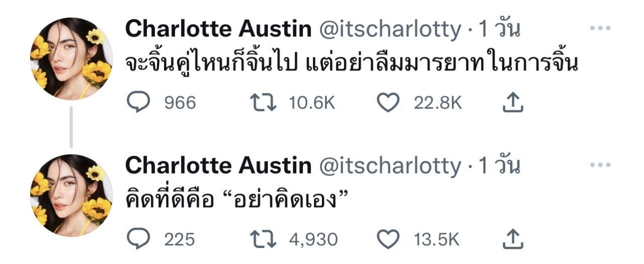 อีกหนึ่งคู่จิ้นนางงามที่มีด้อมแฟนคลับคอยซัพพอร์ตเป็นจำนวนมาก ระหว่างสาว อิงฟ้า วราหะ กับ ชาล็อต ออสติน 2 สาวจากเวทีมิสแกรนด์ไทยแลนด์ 2022 และล่าสุดไม่รู้ว่าเกิดอะไรขึ้น หลังจากที่สาว ชาล็อต ได้ออกมาโพสต์ทวิตเตอร์ส่วนตัว ฟาดแรงถึงแฟนคลับบางคน