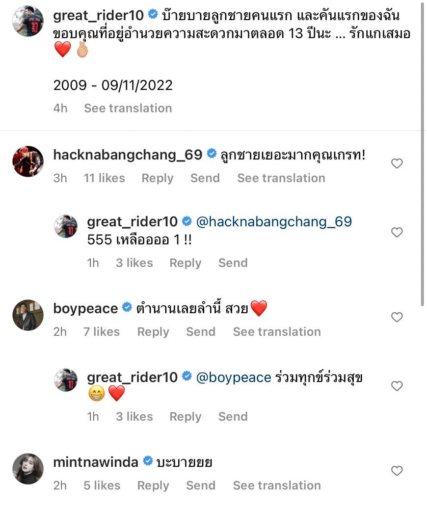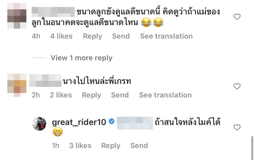 ท่ามกลางคอมเมนต์จากคนในวงการรวมถึงแฟนๆ อาทิ ลูกชายเยอะมากคุณเกรท!, ตำนานเลยลำนี้ สวย, บะบายยย, สุดแล้วตัวนี่, ขนาดลูกยังดูแลดีขนาดนี้ คิดดูว่าถ้าแม่ของลูกในอนาคตจะดูแลดีขนาดไหน ฯลฯ นอกจากนี้ยังมีคนถามว่า "นางไปไหนล่ะพี่เกรท" ซึ่งเกรทตอบว่า "ถ้าสนใจหลังไมค์ได้"