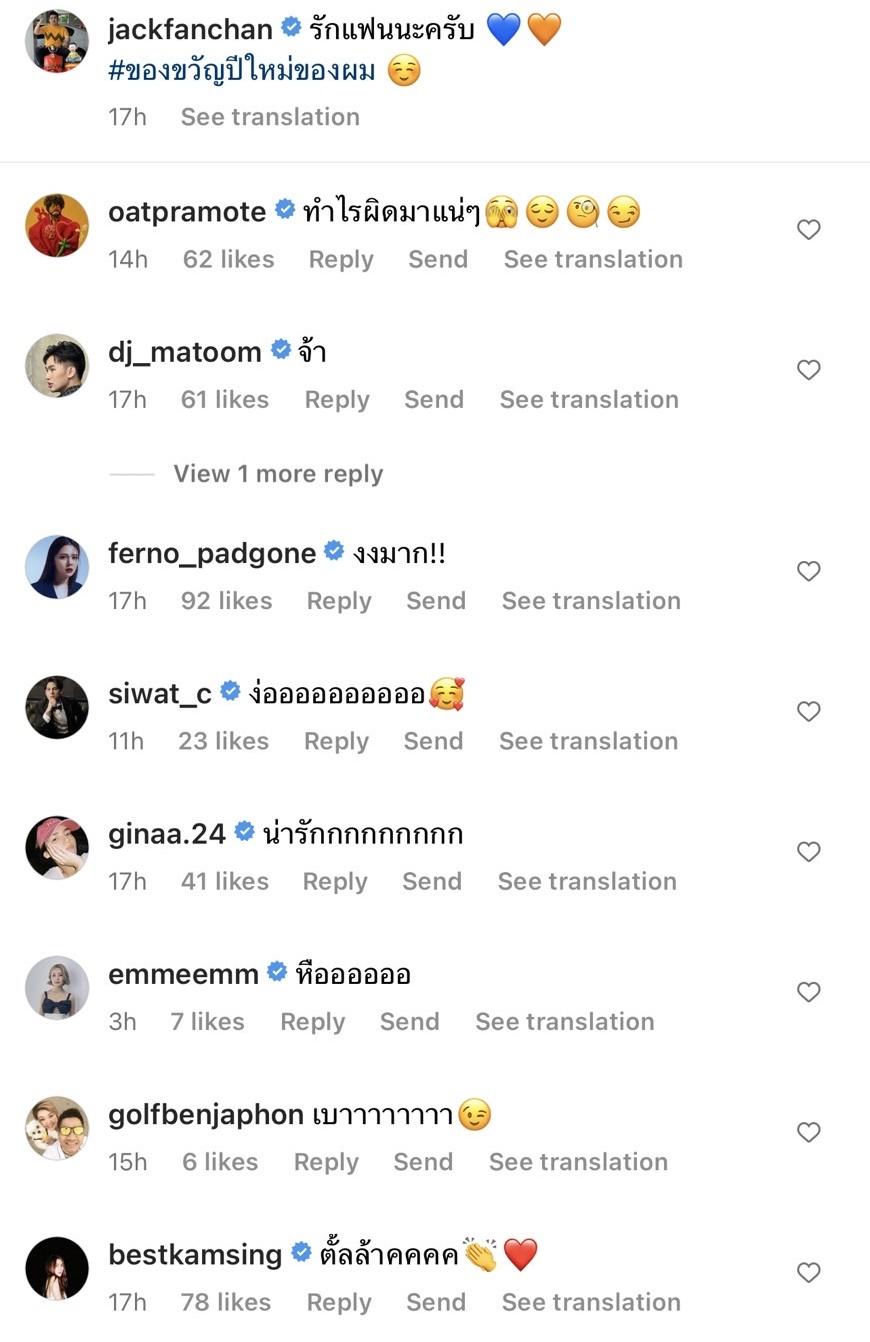 ท่ามกลางคอมเมนต์แซวจากคนในวงการบันเทิง อาทิ โอ๊ต ปราโมทย์ “ทำไรผิดมาแน่ๆ”, มะตูม เตชินท์ “จ้า”, ใบเฟิร์น พัสกร “งงมาก!!”, ซี ศิวัฒน์ “ง่ออออออออออ”, จีน่า วิรายา “น่ารักกกกกกกกก”, เอ็ม บุษราคัม “หืออออออ”, ทอย ปฐมพงศ์ “น่าร้ากกกก”, เบสท์ รักษ์วนีย์ “ตั้ลล้าคคคค” ฯลฯ