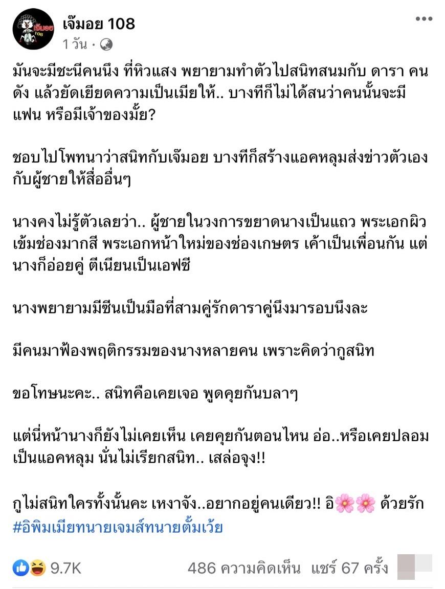 โดยในเพจ เจ๊มอย 108 ได้โพสต์ข้อความว่า “มันจะมีชะนีคนนึง ที่หิวแสง พยายามทำตัวไปสนิทสนมกับ ดารา คนดัง แล้วยัดเยียดความเป็นเมียให้.. บางทีก็ไม่ได้สนว่าคนนั้นจะมีแฟน หรือมีเจ้าของมั้ย?
