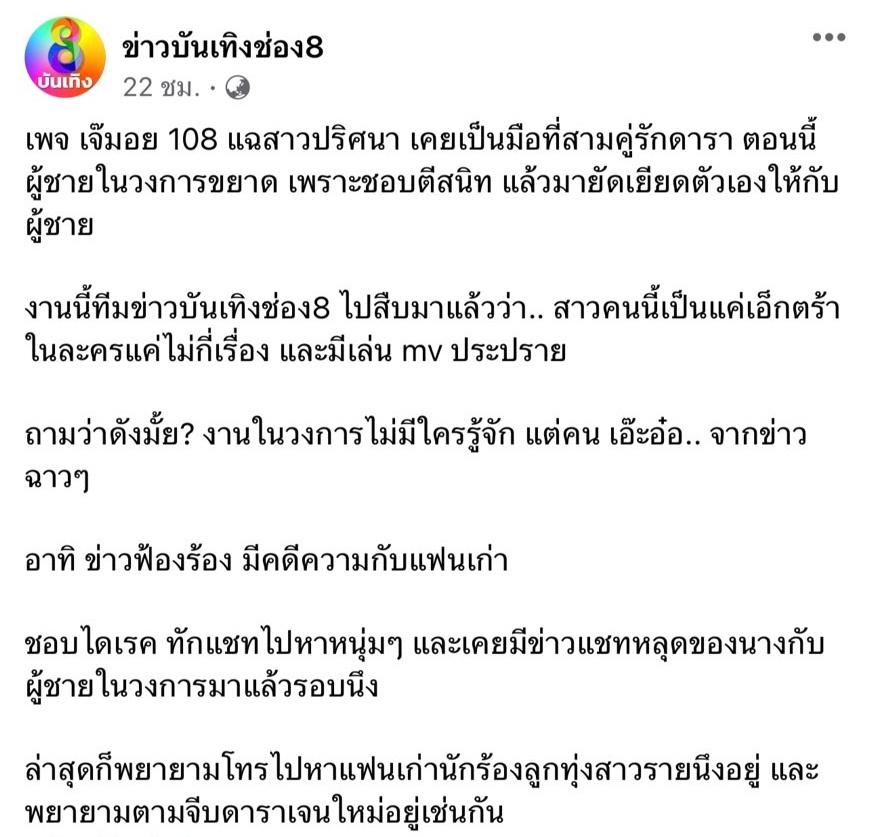 นอกจากนี้ในเพจข่าวบันเทิงช่อง 8 โพสต์ข้อความใบ้เพิ่มเติมเกี่ยวกับสาวคนดังกล่าว โดยบอกว่า สาวคนนี้เป็นแค่เอ็กซ์ตร้าในละครแค่ไม่กี่เรื่อง และมีเล่น mv ประปราย ถามว่าดังไหม งานในวงการไม่มีใครรู้จัก แต่คน เอ๊ะ อ๋อ.. จากข่าวฉาวๆ อาทิ ข่าวฟ้องร้อง มีคดีความกับแฟนเก่า ชอบไดเร็กต์ ทักแชตไปหาหนุ่มๆ และเคยมีข่าวแชตหลุดของนางกับผู้ชายในวงการมาแล้วรอบหนึ่ง ล่าสุดก็พยายาม โทร. ไปหาแฟนเก่านักร้องลูกทุ่งสาวรายหนึ่งอยู่ และพยายามตามจีบดาราเจนใหม่อยู่เช่นกัน.