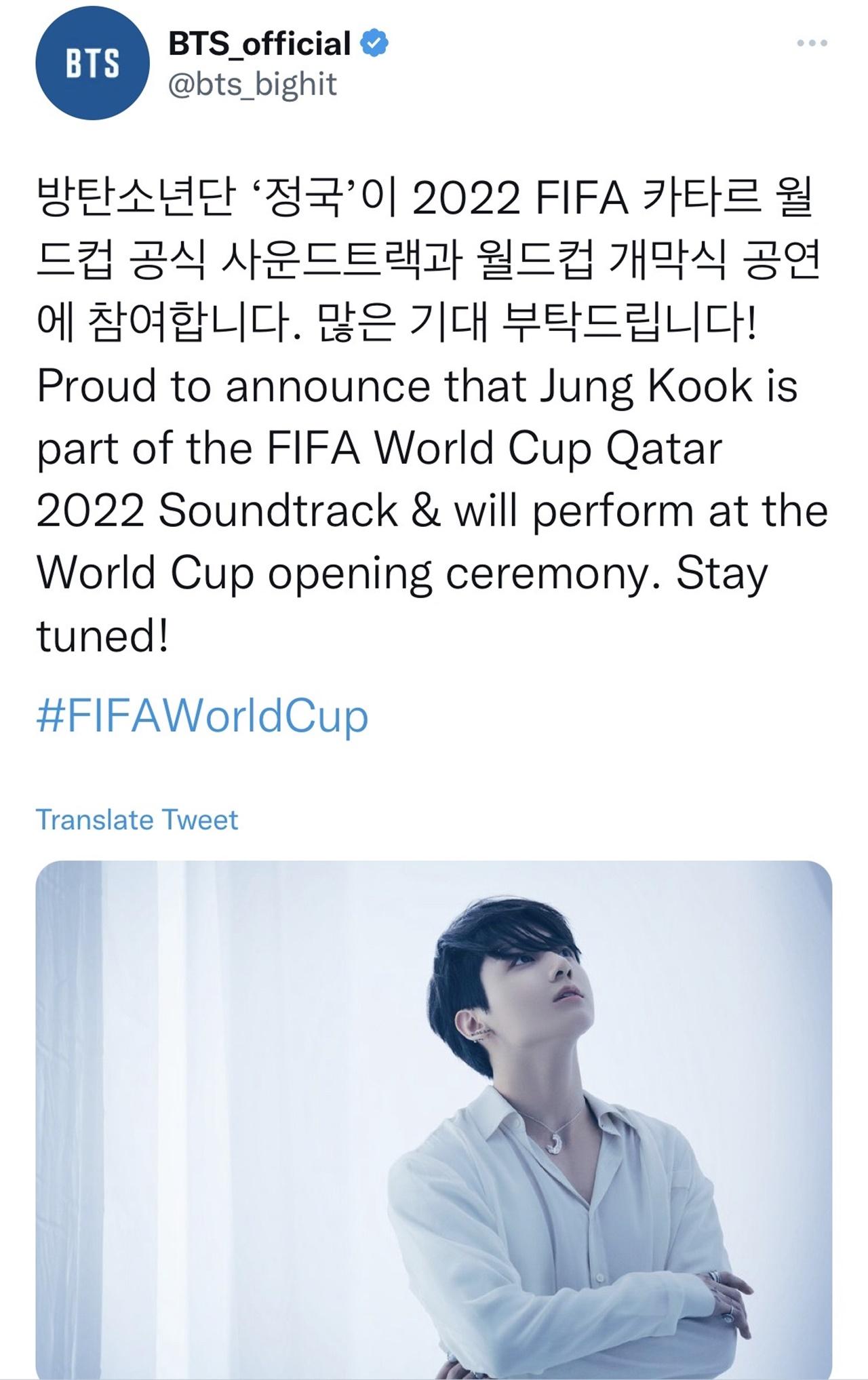 โดย BTS_official แอ็กเคานต์ออฟฟิเชียลของ BTS ได้แจ้งข่าวที่น่ายินดีนี้ว่า “Proud to announce that Jung Kook is part of the FIFA World Cup Qatar 2022 Soundtrack & will perform at the World Cup opening ceremony. Stay tuned!” (พวกเรามีความภาคภูมิใจที่จะประกาศว่า จองกุก ได้เป็นส่วนหนึ่งของเพลงประกอบ FIFA World Cup Qatar 2022 และจะแสดงในพิธีเปิดการแข่งขันฟุตบอลโลก รอติดตาม)"