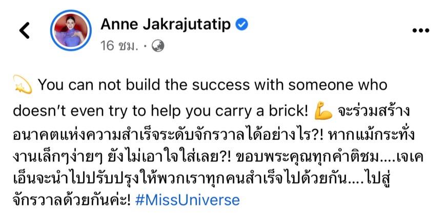 หลังจากนั้น แอน จักรพงษ์ ยังได้ออกมาเผยเหตุผลพร้อมชี้แจงถึงประเด็นดังกล่าว ด้วยการโพสต์ข้อความระบุว่า "You can not build the success with someone who doesn’t even try to help you carry a brick!"