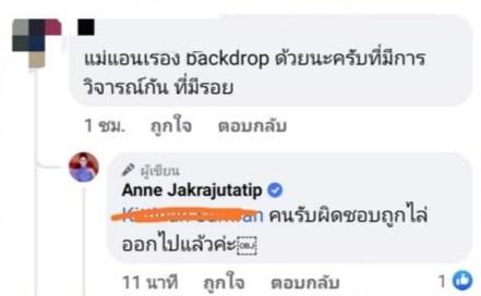 ล่าสุด แอน ก็ออกมาประกาศชัดถึงความเด็ดขาด ไม่ได้มาเล่นๆ ทำให้ แอน จักรพงษ์ ออกมาตอบคอมเมนต์แฟนนางงาม ระบุว่า "เบื้องต้นได้ไล่คนที่ทำหน้าที่ดูแลแบ็คดร็อปดังกล่าวออกไปแล้วค่ะ และได้แก้ปัญหาแบ็คดร็อปทันที"