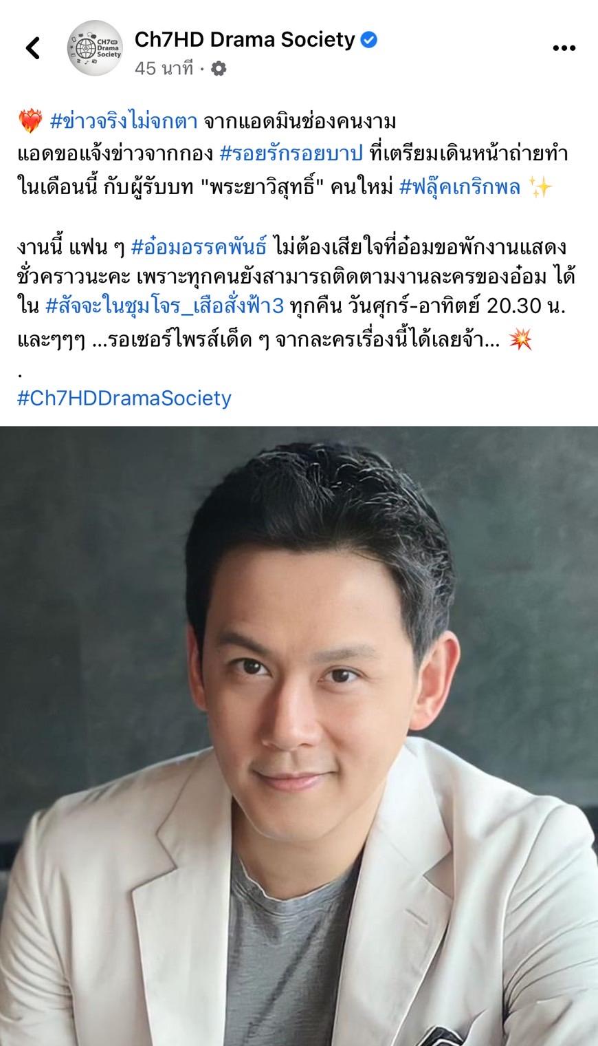 งานนี้ แฟน ๆ #อ๋อมอรรคพันธ์ ไม่ต้องเสียใจที่อ๋อมขอพักงานแสดง ชั่วคราวนะคะ เพราะทุกคนยังสามารถติดตามงานละครของอ๋อม ได้ใน #สัจจะในชุมโจร_เสือสั่งฟ้า3 ทุกคืน วันศุกร์-อาทิตย์ 20.30 น. และๆๆๆ ...รอเซอร์ไพรส์เด็ด ๆ จากละครเรื่องนี้ได้เลยจ้า...#Ch7HDDramaSociety".