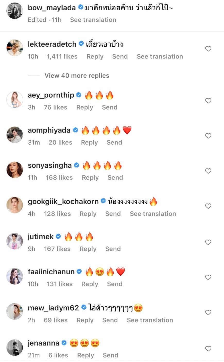 ท่ามกลางคอมเมนต์จากคนในวงการบันเทิงรวมถึงแฟนๆ ที่พร้อมใจส่งอีโมจิหัวใจกับไฟลุกแบบรัวๆ ด้านหวานใจอย่างพระเอกหนุ่มตี๋หล่อ อาเล็ก ธีรเดช ถึงกับทนไม่ไหว โผล่คอมเมนต์สั้นๆ “เดี๋ยวเอาบ้าง” ทำเอาแฟนๆ แห่กดไลค์นับพันก่อนจะคอมเมนต์แซวว่ามีคนหวง แถมบอกว่ารอดูซิกซ์แพ็กด้วย บ้างก็แซวว่าจะใส่บิกินีเหรอ ฯลฯ