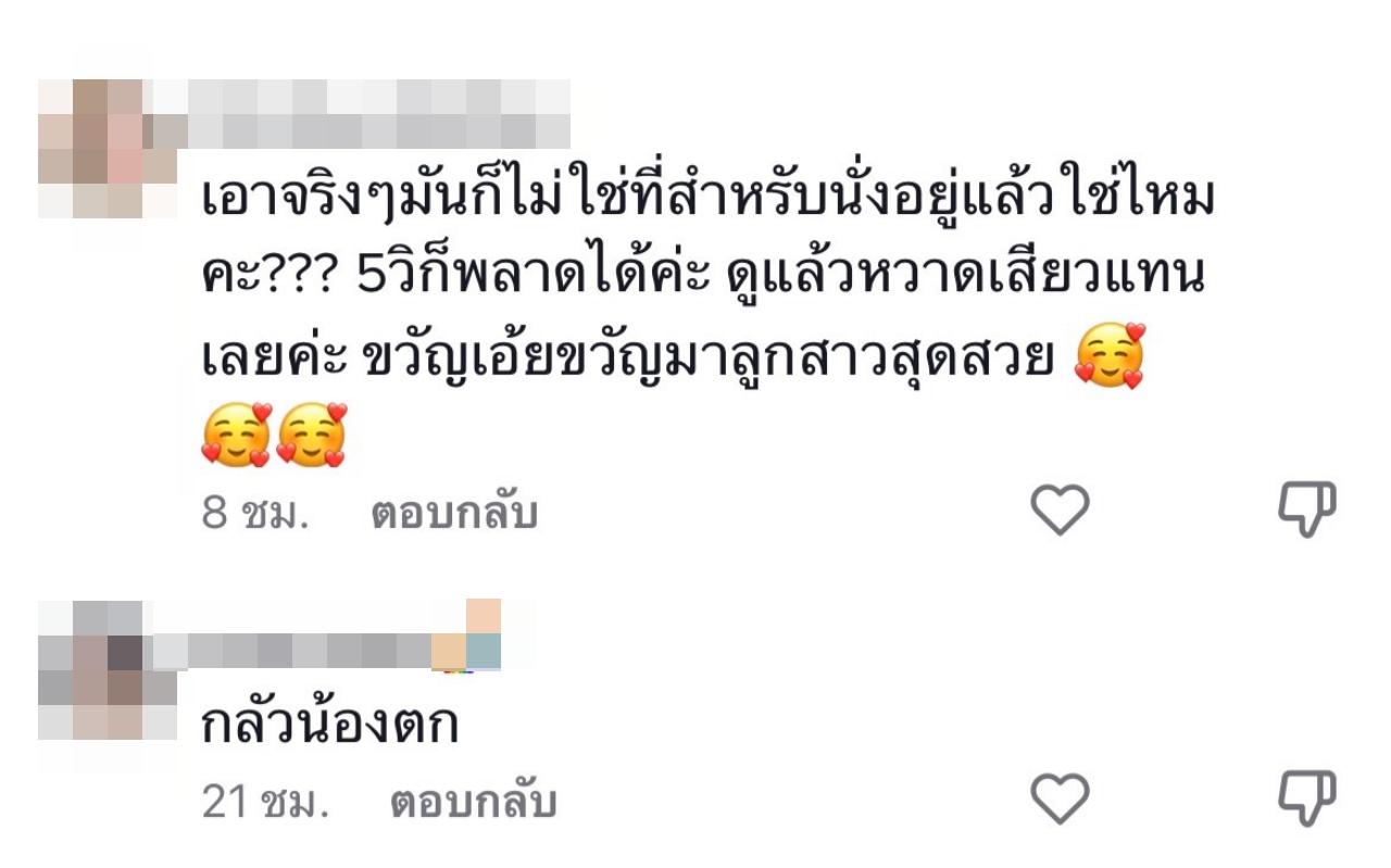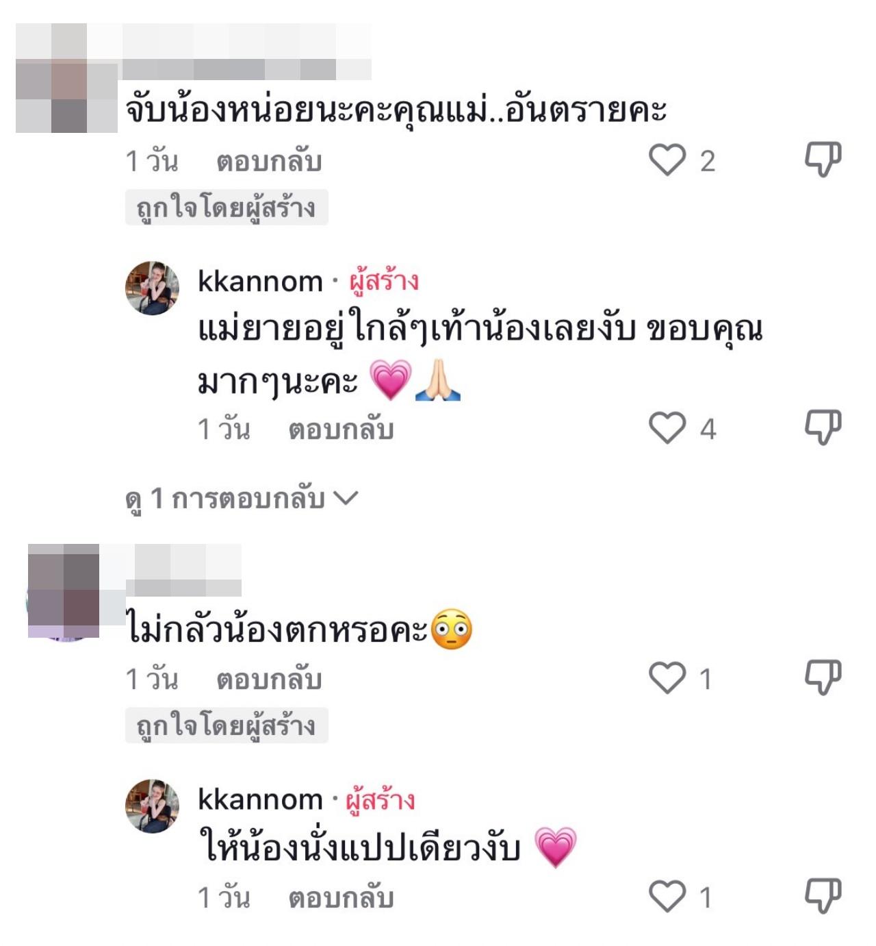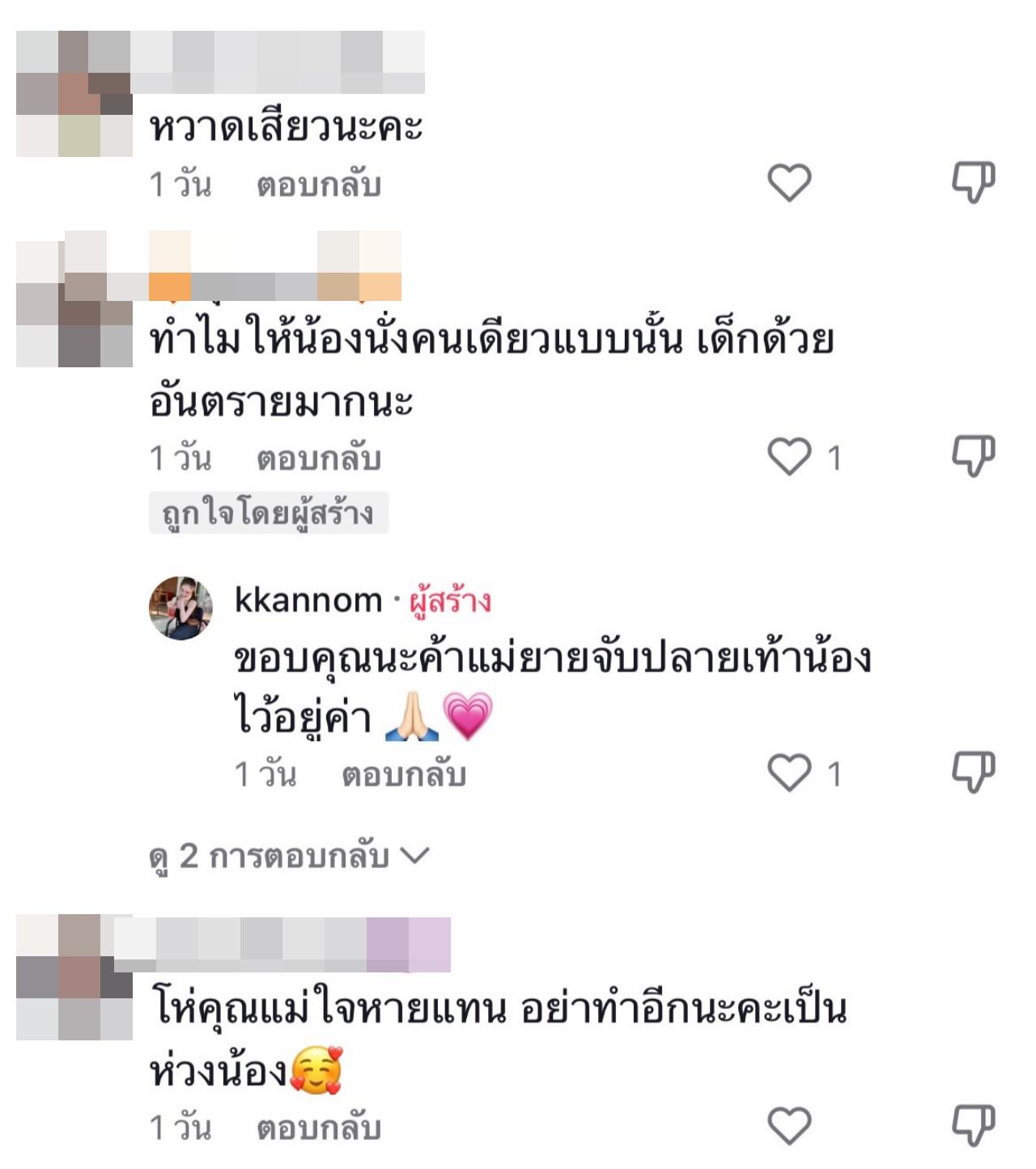 และงานนี้ก็มีชาวเน็ตเข้ามาคอมเมนต์ตำหนิ ขนม ศศิกานต์ ที่จับลูกสาวนั่งอย่างนั้นว่า "ป้าเสียวหงายหลังมากลูก, เสียวน้องตก, ไม่กลัวน้องตกเหรอคะ, จับน้องหน่อยนะคะคุณแม่ อันตรายค่ะ, เอาจริงๆ มันก็ไม่ใช่ที่สำหรับนั่งอยู่แล้วใช่ไหมคะ??? 5 วิก็พลาดได้ค่ะ ดูแล้วหวาดเสียวแทนเลยค่ะ ขวัญเอ้ยขวัญมาลูกสาวสุดสวย, อย่าประมาทนะค้า กลัวหงายหลังจับไม่ทัน เด็กๆ ยังประคองตัวไม่ได้ดีเท่าผู้ใหญ่ แค่เห็นสูงๆ ก็ใจหวิวๆ แล้ว"