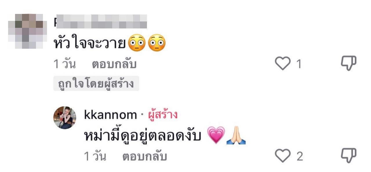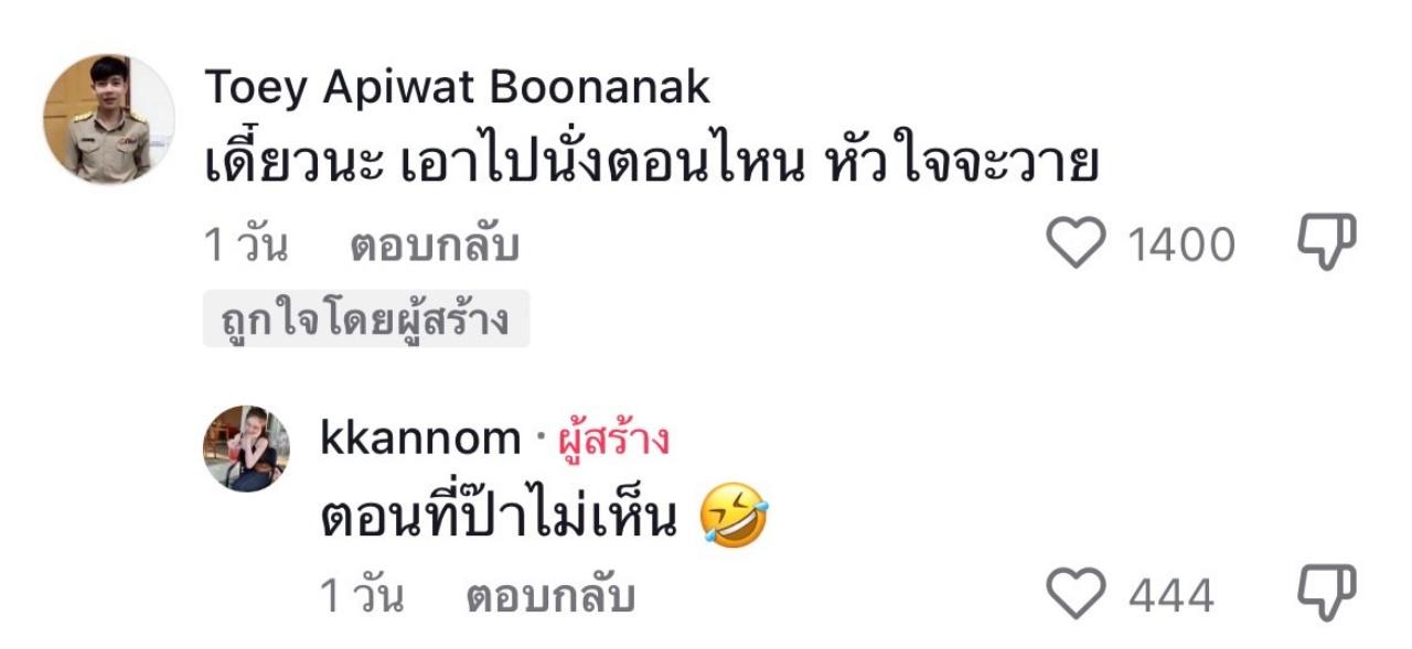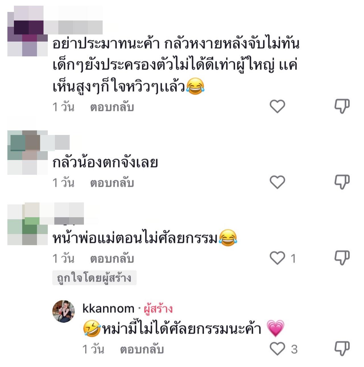 โดยคลิปดังกล่าว ขนม จับลูกสาวนั่งบนขอบโต๊ะที่อยู่ติดกับริมเขาในคาเฟ่แห่งหนึ่ง ทำเอา ครูเต้ย ถึงกับเข้ามาคอมเมนต์ถามภรรยาว่า “เดี๋ยวนะ เอาไปนั่งตอนไหน หัวใจจะวาย”