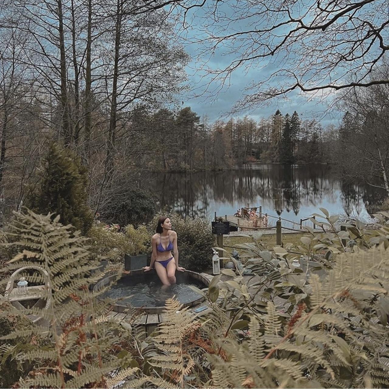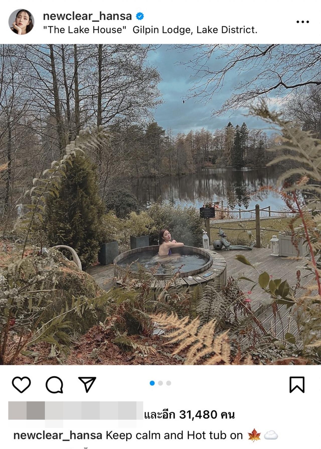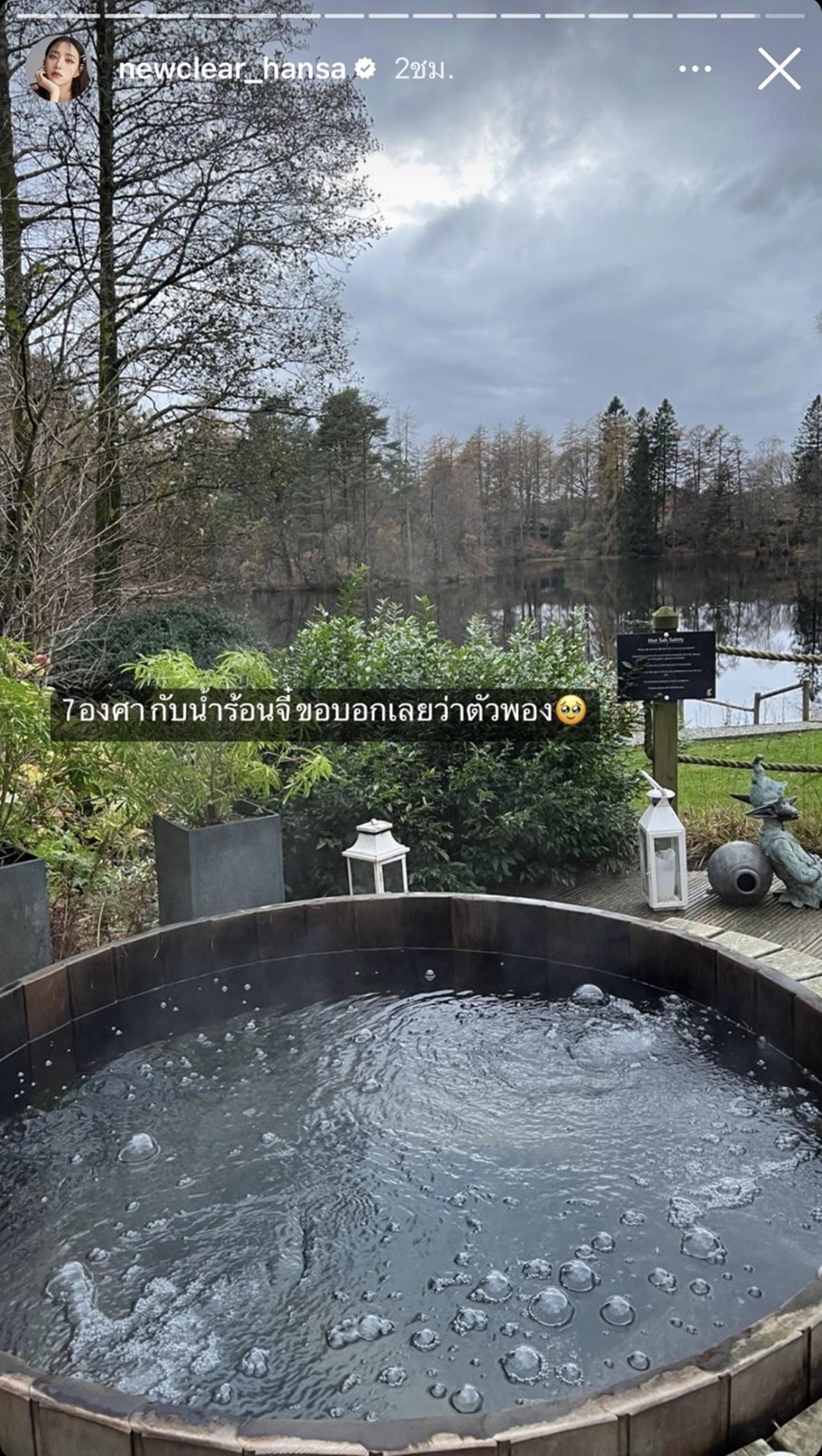 ล่าสุด นิวเคลียร์ ได้ไปเที่ยวพักผ่อนที่ประเทศอังกฤษ ซึ่งที่นั่นอากาศกำลังหนาวเลยทีเดียว แต่งานนี้ แม่นิว ขอสลัดผ้าท้าลมหนาวสักหน่อย โดยได้ใส่บิกินีตัวจิ๋วสีม่วง นั่งแช่น้ำร้อนที่กำลังเดือดปุดๆ ท่ามกลางอากาศหนาว 7 องศา โดยเจ้าตัวได้โพสต์ภาพในไอจีสตอรี่และเขียนว่า "7 องศากับน้ำร้อนจี๋ ขอบอกเลยว่าตัวพอง".