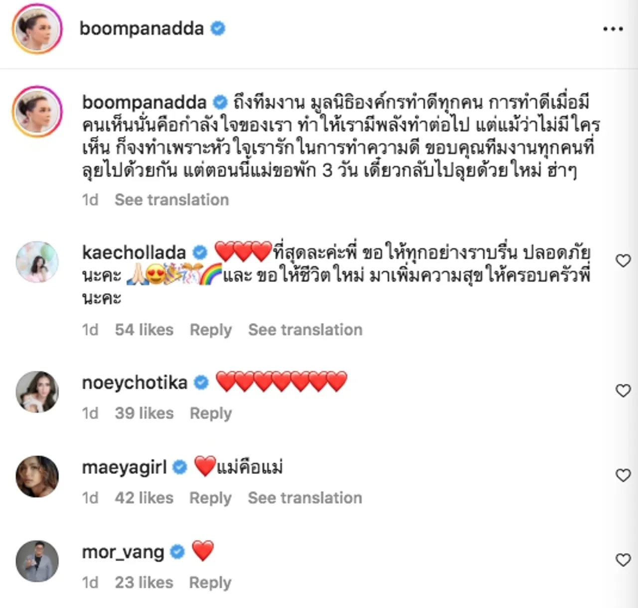 ด้าน แม่บุ๋ม ยังได้ระบุแคปชั่นในโพสต์ดังกล่าวว่า "ถึงทีมงาน มูลนิธิองค์กรทำดีทุกคน การทำดีเมื่อมีคนเห็นนั่นคือกำลังใจของเรา ทำให้เรามีพลังทำต่อไป แต่แม้ว่าไม่มีใครเห็น ก็จงทำเพราะหัวใจเรารักในการทำความดี ขอบคุณทีมงานทุกคนที่ลุยไปด้วยกัน แต่ตอนนี้แม่ขอพัก 3 วัน เดี๋ยวกลับไปลุยด้วยใหม่ ฮ่าๆ".