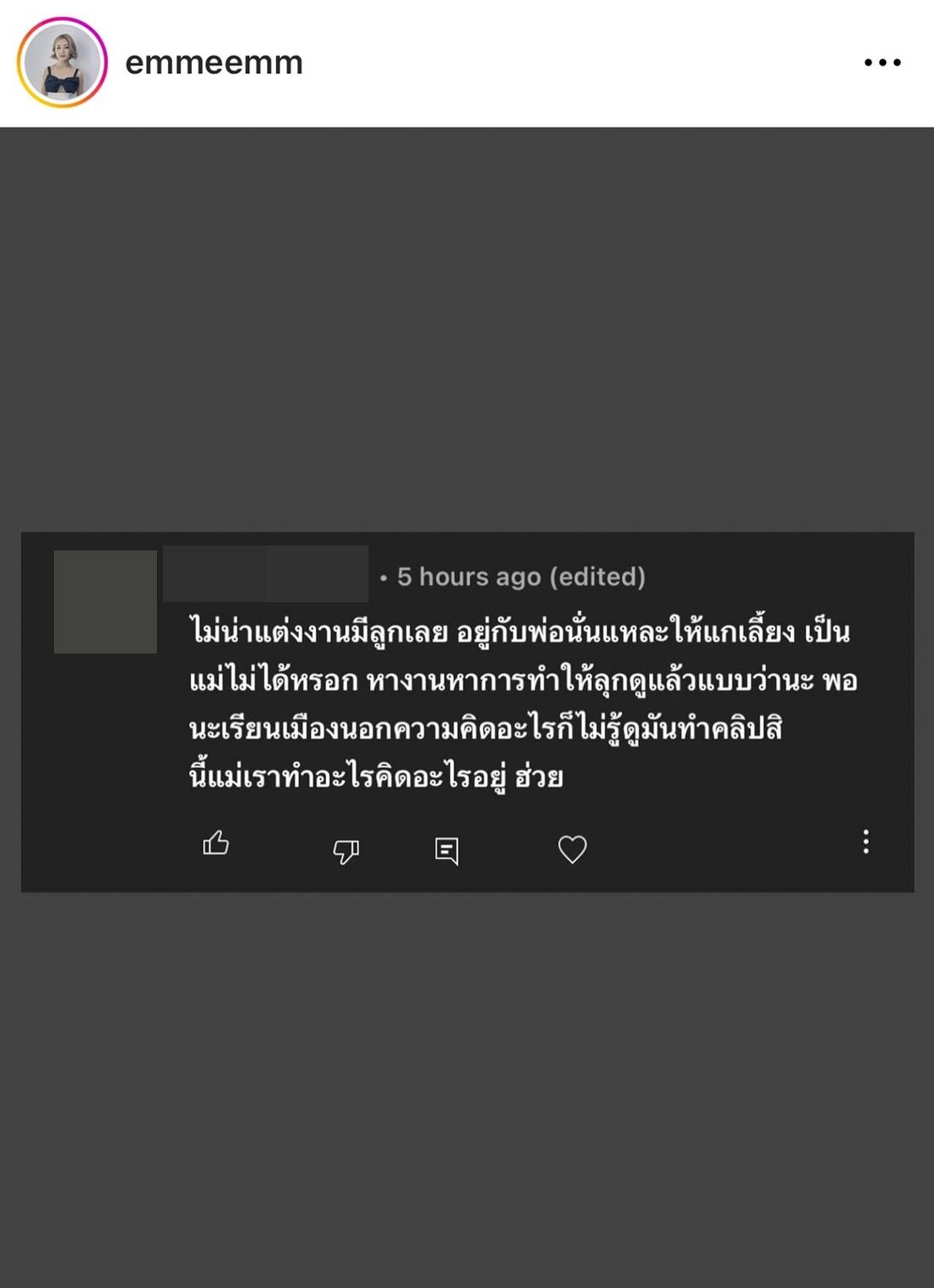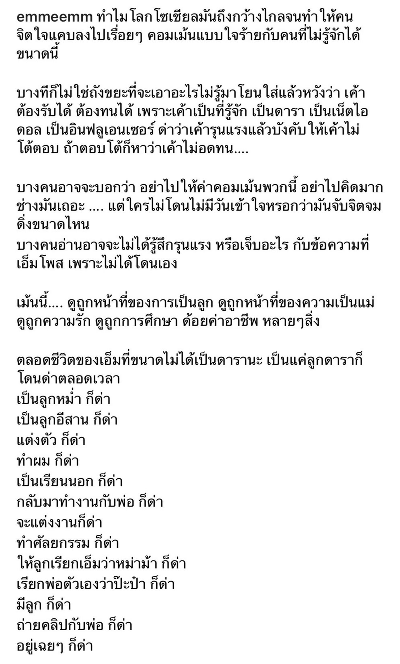 ตลอดชีวิตของเอ็มที่ขนาดไม่ได้เป็นดารานะ เป็นแค่ลูกดาราก็โดนด่าตลอดเวลา เป็นลูกหม่ำ ก็ด่า เป็นลูกอีสาน ก็ด่า แต่งตัว ก็ด่า ทำผม ก็ด่า เป็นเรียนนอก ก็ด่า กลับมาทำงานกับพ่อ ก็ด่า จะแต่งงานก็ด่า ทำศัลยกรรม ก็ด่า ให้ลูกเรียกเอ็มว่าหม่าม้า ก็ด่า เรียกพ่อตัวเองว่าป๊ะป๋า ก็ด่า มีลูก ก็ด่า ถ่ายคลิปกับพ่อ ก็ด่า