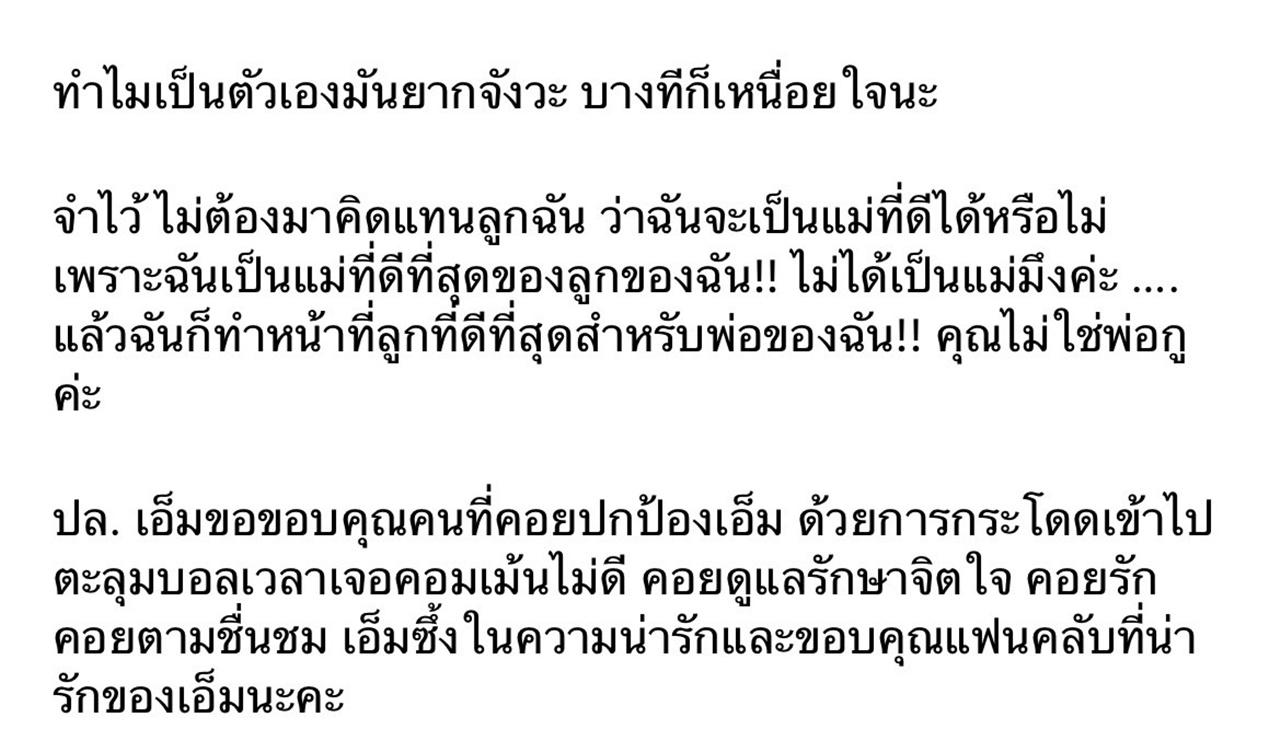 ปล. เอ็มขอขอบคุณคนที่คอยปกป้องเอ็ม ด้วยการกระโดดเข้าไปตะลุมบอลเวลาเจอคอมเม้นไม่ดี คอยดูแลรักษาจิตใจ คอยรักคอยตามชื่นชม เอ็มซึ้งในความน่ารักและขอบคุณแฟนคลับที่น่ารักของเอ็มนะคะ".