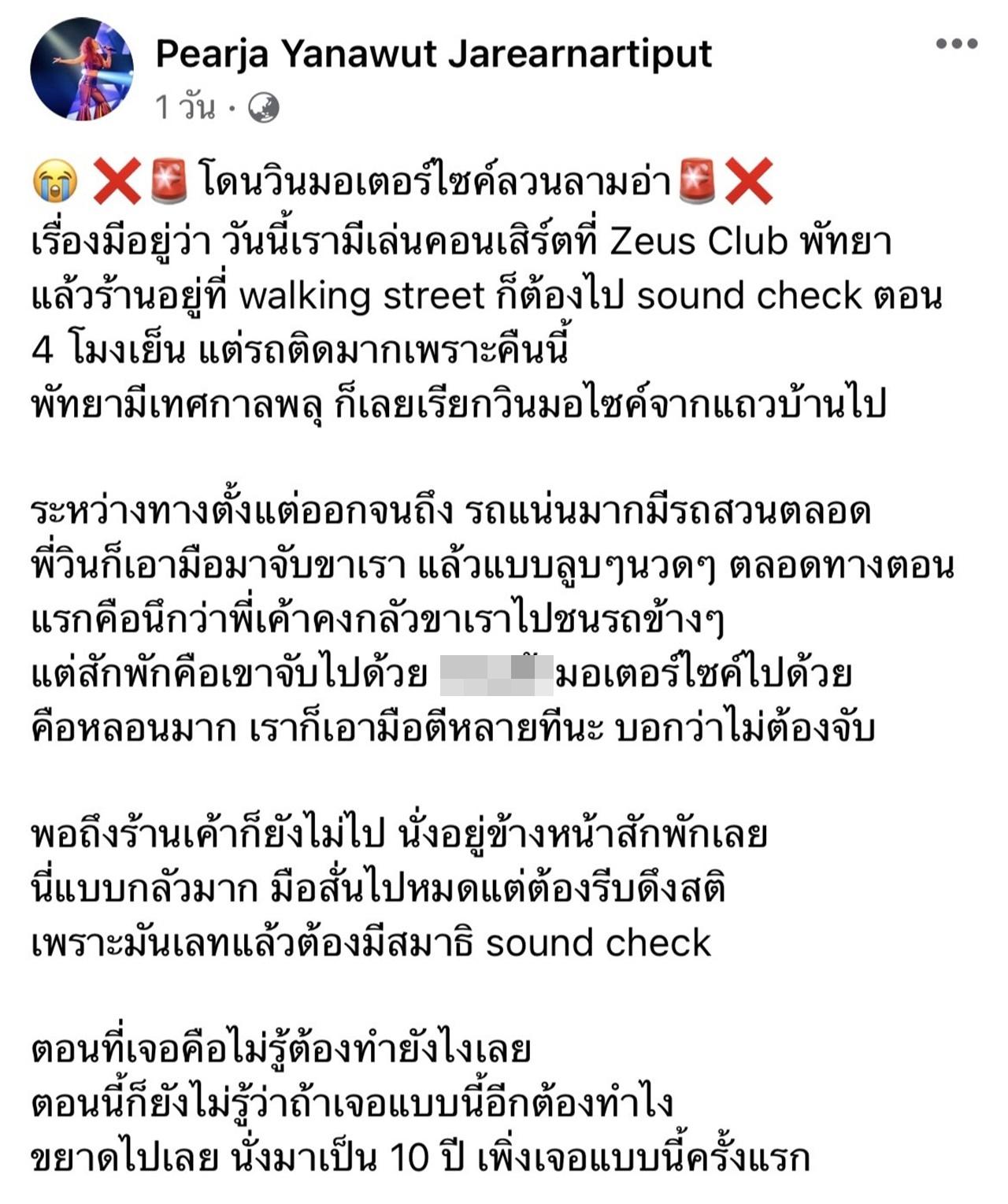 "โดนวินมอเตอร์ไซค์ลวนลามอ่า เรื่องมีอยู่ว่า วันนี้เรามีเล่นคอนเสิร์ตที่ Zeus Club พัทยา แล้วร้านอยู่ที่ walking street ก็ต้องไป sound check ตอน 4 โมงเย็น แต่รถติดมากเพราะคืนนี้พัทยามีเทศกาลพลุ ก็เลยเรียกวินมอไซค์จากแถวบ้านไป