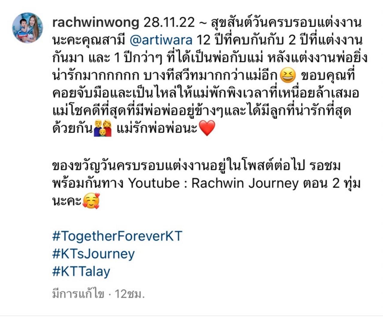 "28.11.22 สุขสันต์วันครบรอบแต่งงานนะคะคุณสามี @artiwara 12 ปีที่คบกันกับ 2 ปีที่แต่งงานกันมา และ 1 ปีกว่าๆ ที่ได้เป็นพ่อกับแม่ หลังแต่งงานพ่อยิ่งน่ารักมากกกกก บางทีสวีตมากกว่าแม่อีก ขอบคุณที่คอยจับมือและเป็นไหล่ให้แม่พักพิงเวลาที่เหนื่อยล้าเสมอ แม่โชคดีที่สุดที่มีพ่อพ่ออยู่ข้างๆ และได้มีลูกที่น่ารักที่สุดด้วยกัน แม่รักพ่อพ่อนะ"