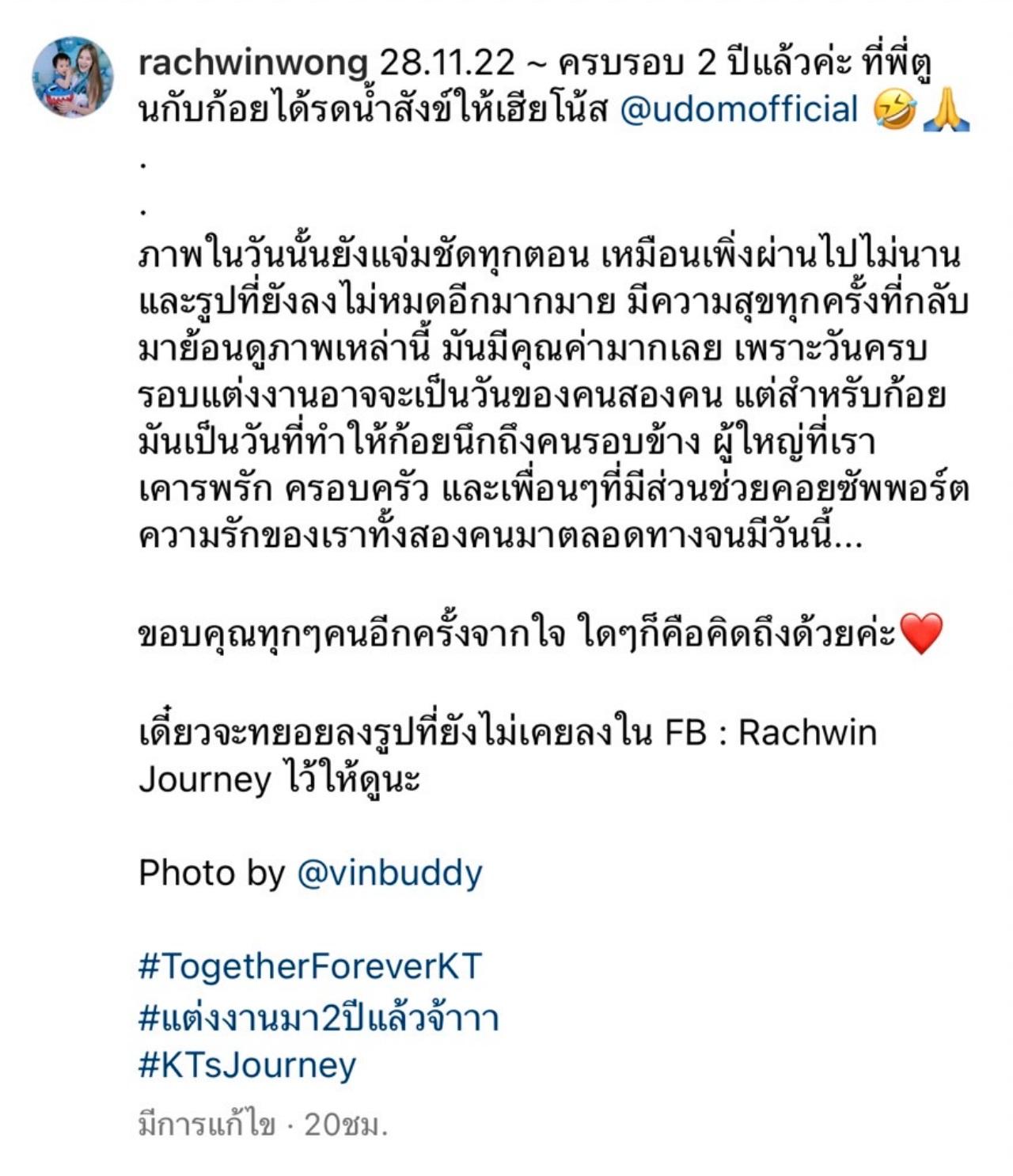 "28.11.22 ครบรอบ 2 ปีแล้วค่ะ ที่พี่ตูนกับก้อยได้รดน้ำสังข์ให้เฮียโน้ส @udomofficial ภาพในวันนั้นยังแจ่มชัดทุกตอน เหมือนเพิ่งผ่านไปไม่นาน และรูปที่ยังลงไม่หมดอีกมากมาย มีความสุขทุกครั้งที่กลับมาย้อนดูภาพเหล่านี้ มันมีคุณค่ามากเลย เพราะวันครบรอบแต่งงานอาจจะเป็นวันของคนสองคน แต่สำหรับก้อย มันเป็นวันที่ทำให้ก้อยนึกถึงคนรอบข้าง ผู้ใหญ่ที่เราเคารพรัก ครอบครัว และเพื่อนๆ ที่มีส่วนช่วยคอยซัพพอร์ตความรักของเราทั้งสองคนมาตลอดทางจนมีวันนี้... ขอบคุณทุกๆ คนอีกครั้งจากใจ ใดๆ ก็คือคิดถึงด้วยค่ะ".