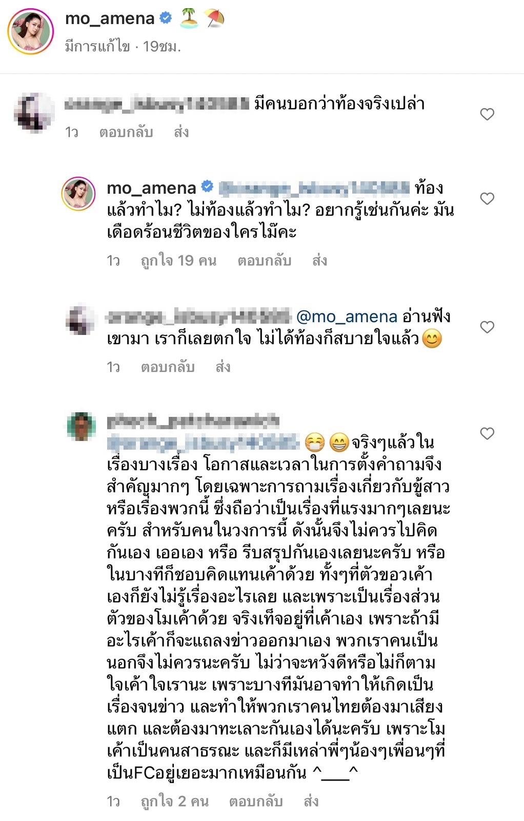 ซึ่งแน่นอนว่างานนี้สาว โม อมีนา ก็ไม่ปล่อยผ่าน สวนกลับแบบฟาดๆ ทันทีว่า "ท้องแล้วทำไม ? ไม่ท้องแล้วทำไม? อยากรู้เช่นกันค่ะ มันเดือดร้อนชีวิตของใครมั้ยคะ"