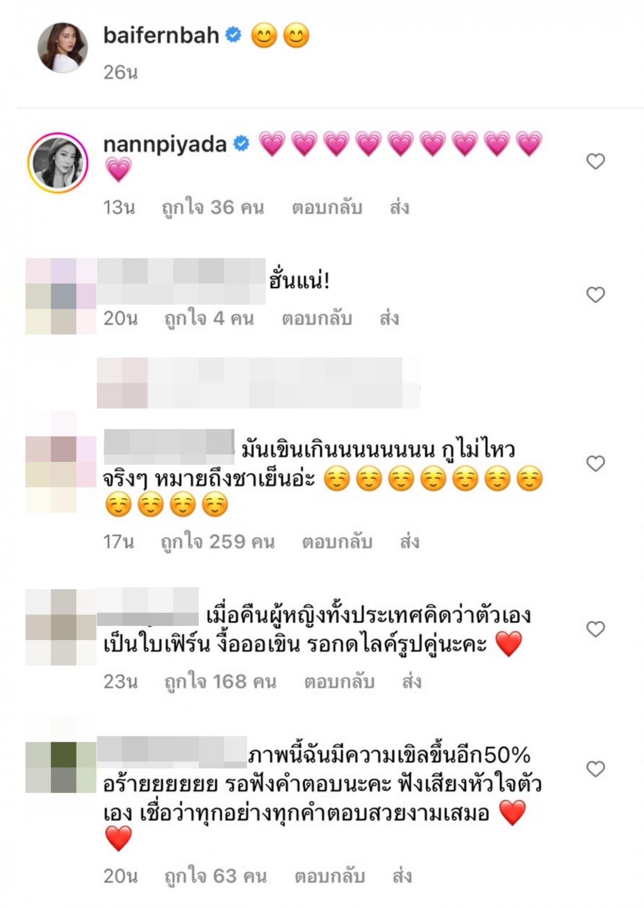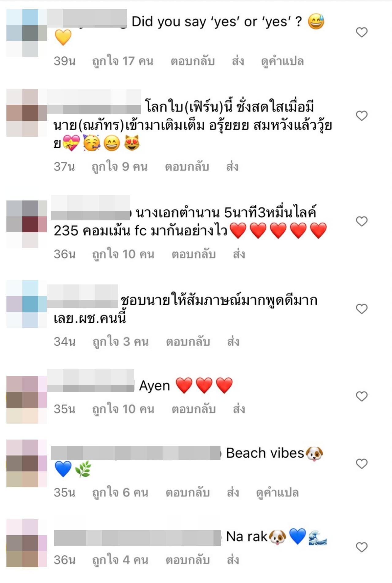 ด้าน ใบเฟิร์น เอง ก็ยังไม่ได้ตอบอะไร โดยในอินสตาแกรมของเธอนั้น ได้พาครอบครัวพร้อมด้วยน้องหมาไปเที่ยวพักผ่อนสุดชิลและเช็กอินที่ทะเลหัวหิน ซึ่งหลายคนที่ติดตามต่างเข้ามากดไลค์ กดหัวใจกันเป็นจำนวนมาก พร้อมกับคอมเมนต์ไปในทิศทางเดียวกันว่า รู้สึกเขินแทนคนกำลังมีความรัก อยากได้ยินคำตอบเร็วๆ และชัดๆ จากปากของ ใบเฟิร์น ว่าจะรับรัก นาย หรือไม่ ช่วยตอบที.