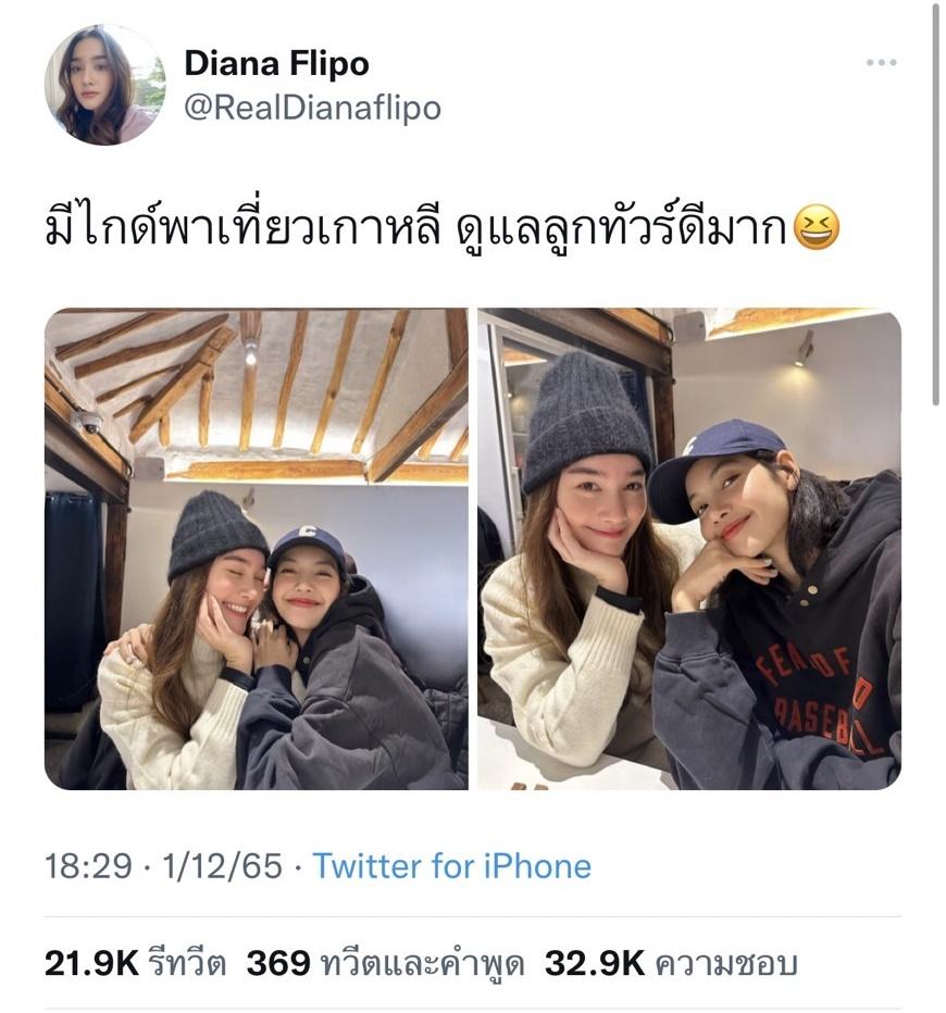 และล่าสุด เดียร์น่าโพสต์ภาพคู่กับลิซ่า BLACKPINK ลงในทวิตเตอร์ส่วนตัว @RealDianaflipo พร้อมทั้งเขียนแคปชั่นว่า “มีไกด์พาเที่ยวเกาหลี ดูแลลูกทัวร์ดีมาก” และใส่อีโมจิหน้ายิ้ม เรียกว่าเป็นทริปเกาหลีที่ทำเอาหลายๆ คนอิจฉาเดียร์น่ากันแบบรัวๆ เลยทีเดียว