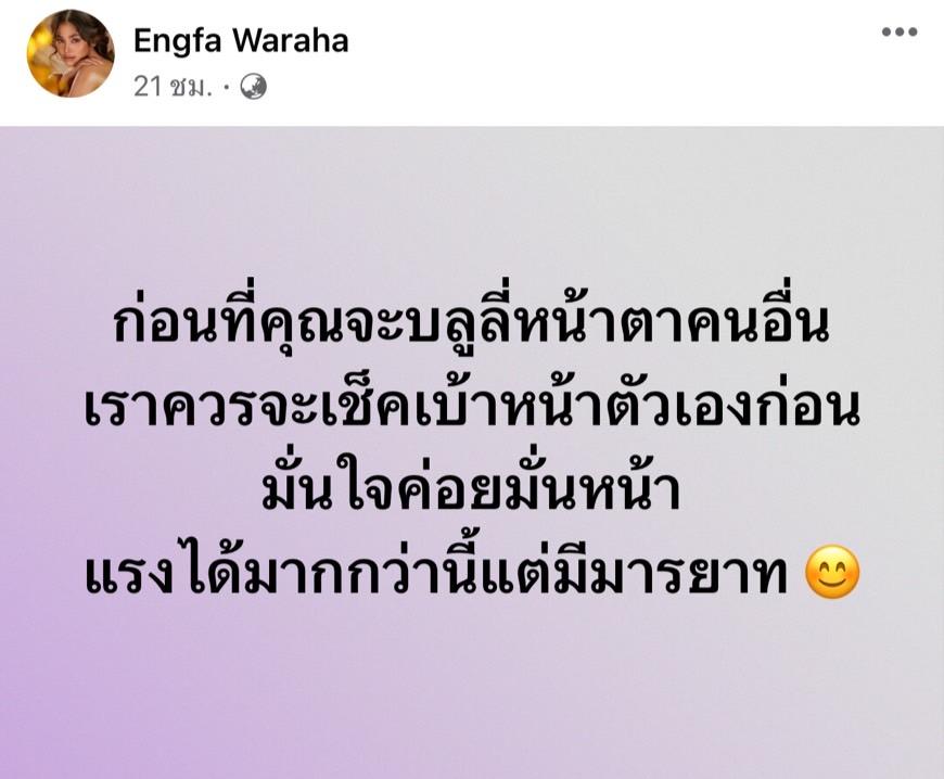 โดยข้อความดังกล่าวได้ระบุเอาไว้ว่า "ก่อนที่คุณจะบูลลี่หน้าตาคนอื่น เราควรจะเช็กเบ้าหน้าตัวเองก่อน มั่นใจค่อยมั่นหน้า แรงได้มากกว่านี้แต่มีมารยาท" งานนี้ชาวเน็ตเข้ามาคอมเมนต์ถูกอกถูกใจกันเป็นจำนวนมาก.