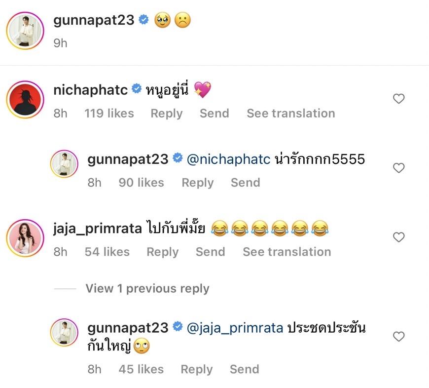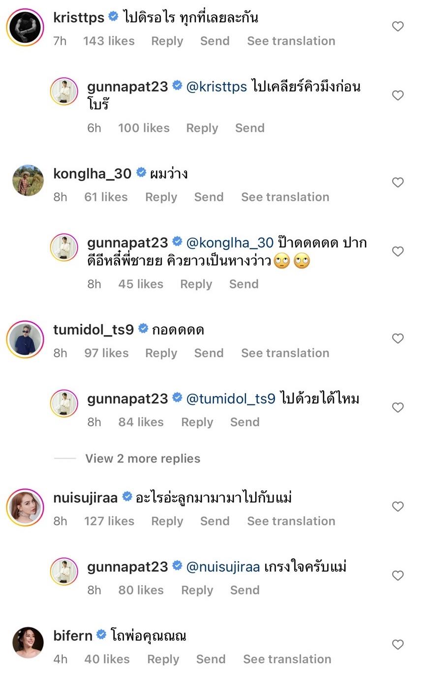 ท่ามกลางคอมเมนต์จากคนในวงการบันเทิงแห่แซว อาทิ แพรวา ณิชาภัทร “หนูอยู่นี่”, จ๊ะจ๋า พริมรตา “ไปกับพี่มั้ย” และใส่อีโมจิขำน้ำตาไหล, คริส พีรวัส “ไปดิรอไร ทุกที่เลยละกัน”, ก้อง ห้วยไร่ “ผมว่าง”, ตั้ม วราวุธ “กอดดดด”, นุ้ย สุจิรา “อะไรอ่ะลูกมามามาไปกับแม่” ฯลฯ