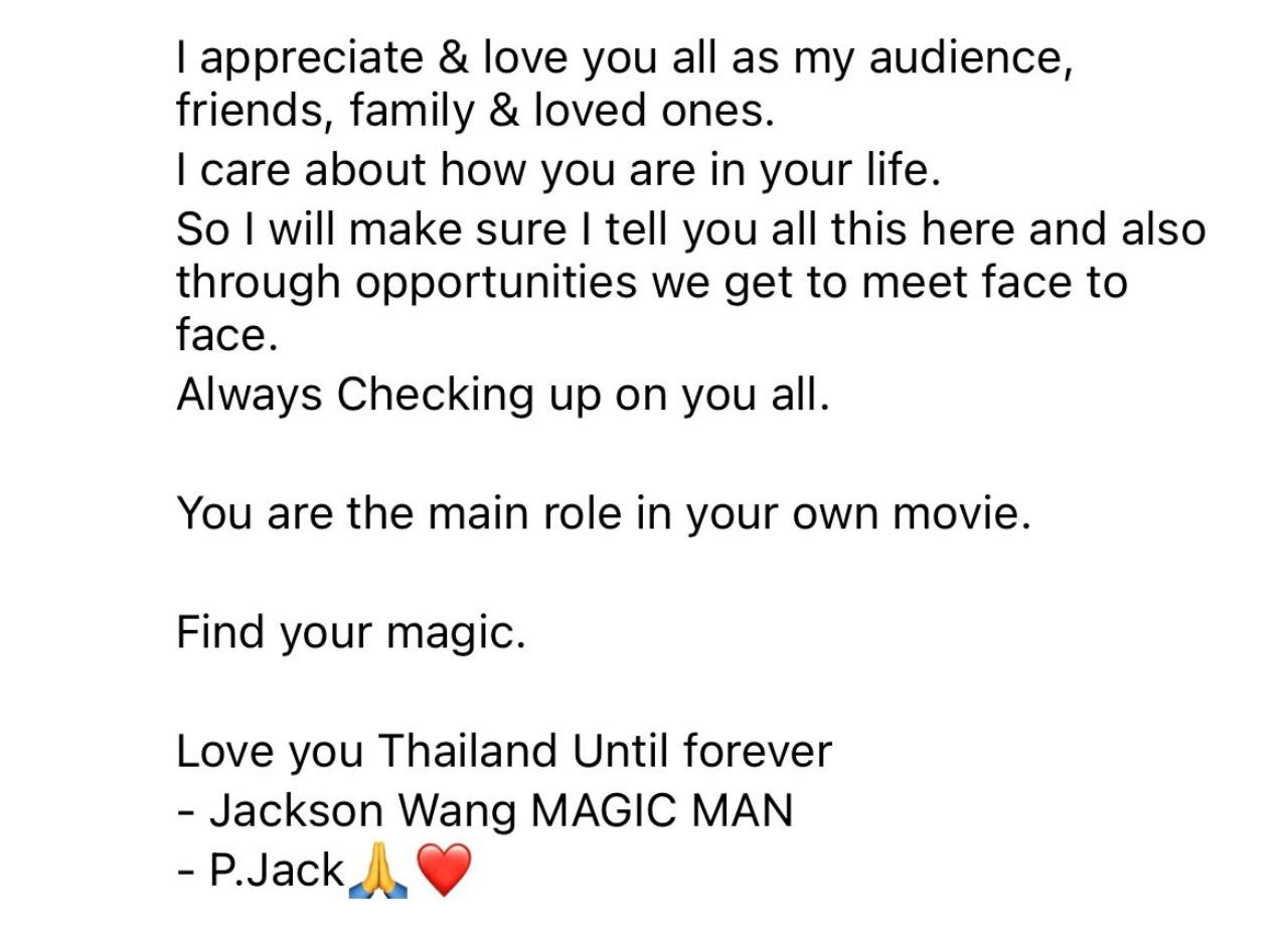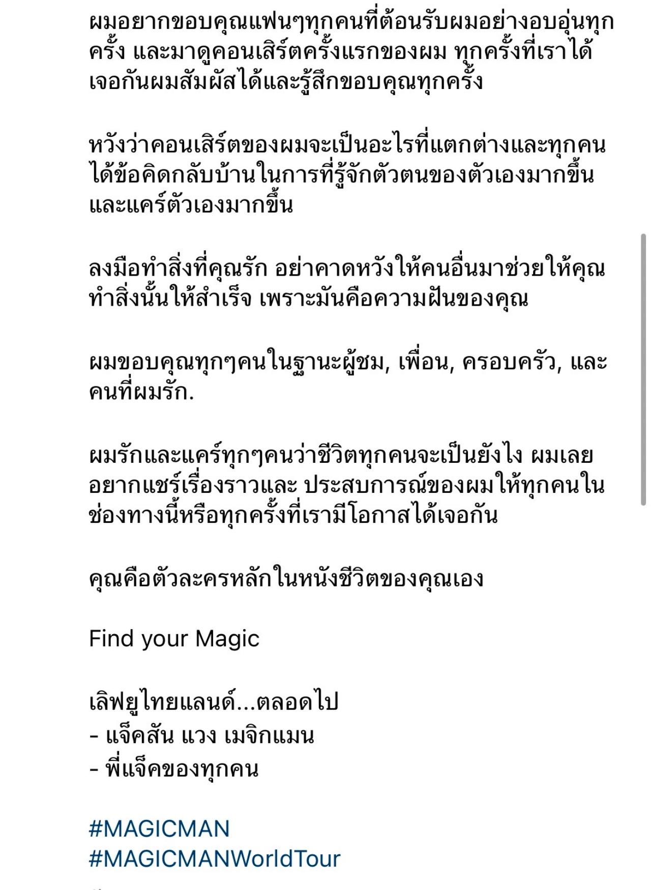 ผมขอบคุณทุกๆ คนในฐานะผู้ชม, เพื่อน, ครอบครัว และคนที่ผมรัก ผมรักและแคร์ทุกๆ คนว่าชีวิตทุกคนจะเป็นยังไง ผมเลยอยากแชร์เรื่องราวและประสบการณ์ของผมให้ทุกคนในช่องทางนี้หรือทุกครั้งที่เรามีโอกาสได้เจอกัน คุณคือตัวละครหลักในหนังชีวิตของคุณเอง Find your Magic เลิฟยูไทยแลนด์...ตลอดไป - แจ็คสัน แวง เมจิกแมน - พี่แจ็คของทุกคน #MAGICMAN #MAGICMANWorldTour”