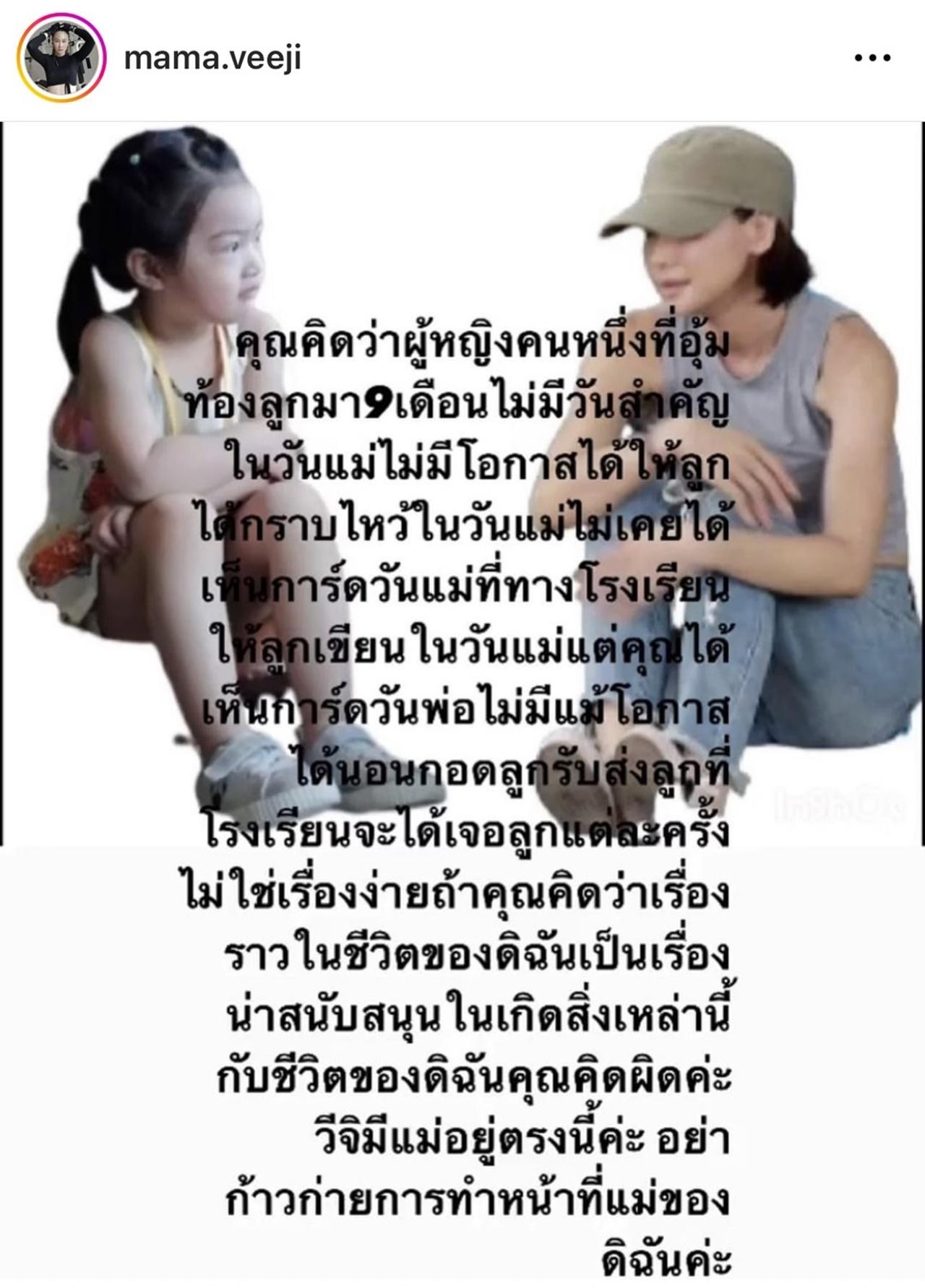 จากนั้น กุ้งพลอย ก็ยังได้โพสต์ข้อความต่ออีกว่า "คุณคิดว่าผู้หญิงคนหนึ่งที่อุ้มท้องลูกมา 9 เดือน ไม่มีวันสำคัญในวันแม่ ไม่มีโอกาสได้ให้ลูกได้กราบไหว้ในวันแม่ ไม่เคยได้เห็นการ์ดวันแม่ที่ทางโรงเรียนให้ลูกเขียนในวันแม่ แต่คุณได้เห็นการ์ดวันพ่อ ไม่มีแม้โอกาสได้นอนกอดลูก รับส่งลูกที่โรงเรียน จะได้เจอลูกแต่ละครั้งไม่ใช่เรื่องง่าย ถ้าคุณคิดว่าเรื่องราวในชีวิตของดิฉันเป็นเรื่องน่าสนับสนุนในเกิดสิ่งเหล่านี้กับชีวิตของดิฉัน คุณคิดผิดค่ะ วีจิมีแม่อยู่ตรงนี้ค่ะ อย่าก้าวก่ายการทำหน้าที่แม่ของดิฉันค่ะ"