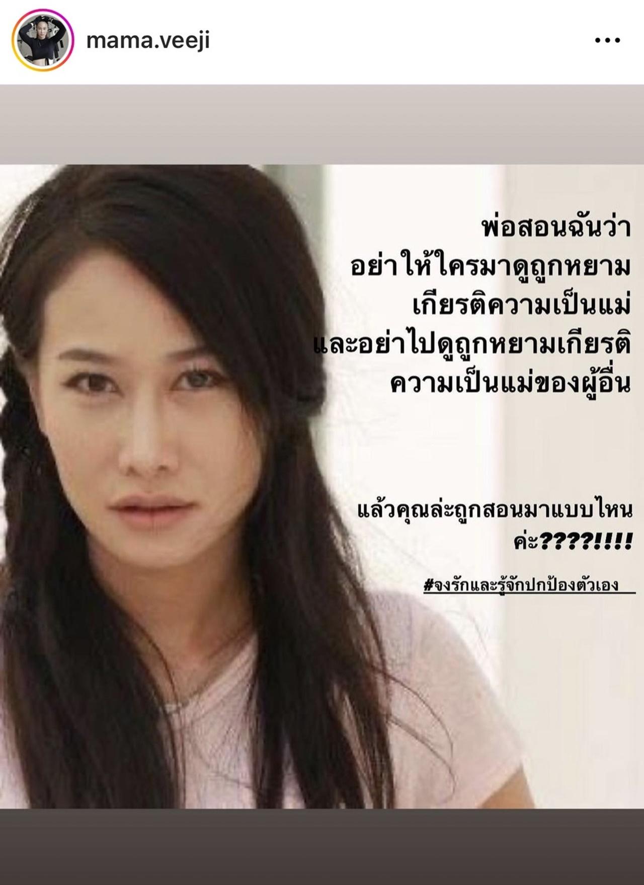 และยังมีข้อความอีกโพสต์ว่า "พ่อสอนฉันว่าอย่าให้ใครมาดูถูกเหยียดหยามเกียรติความเป็นแม่ และอย่าไปดูถูกหยามเกียรติความเป็นแม่ของผู้อื่น แล้วคุณล่ะ ถูกสอนมาแบบไหนคะ????? #จงรักและรู้จักปกป้องตัวเอง"