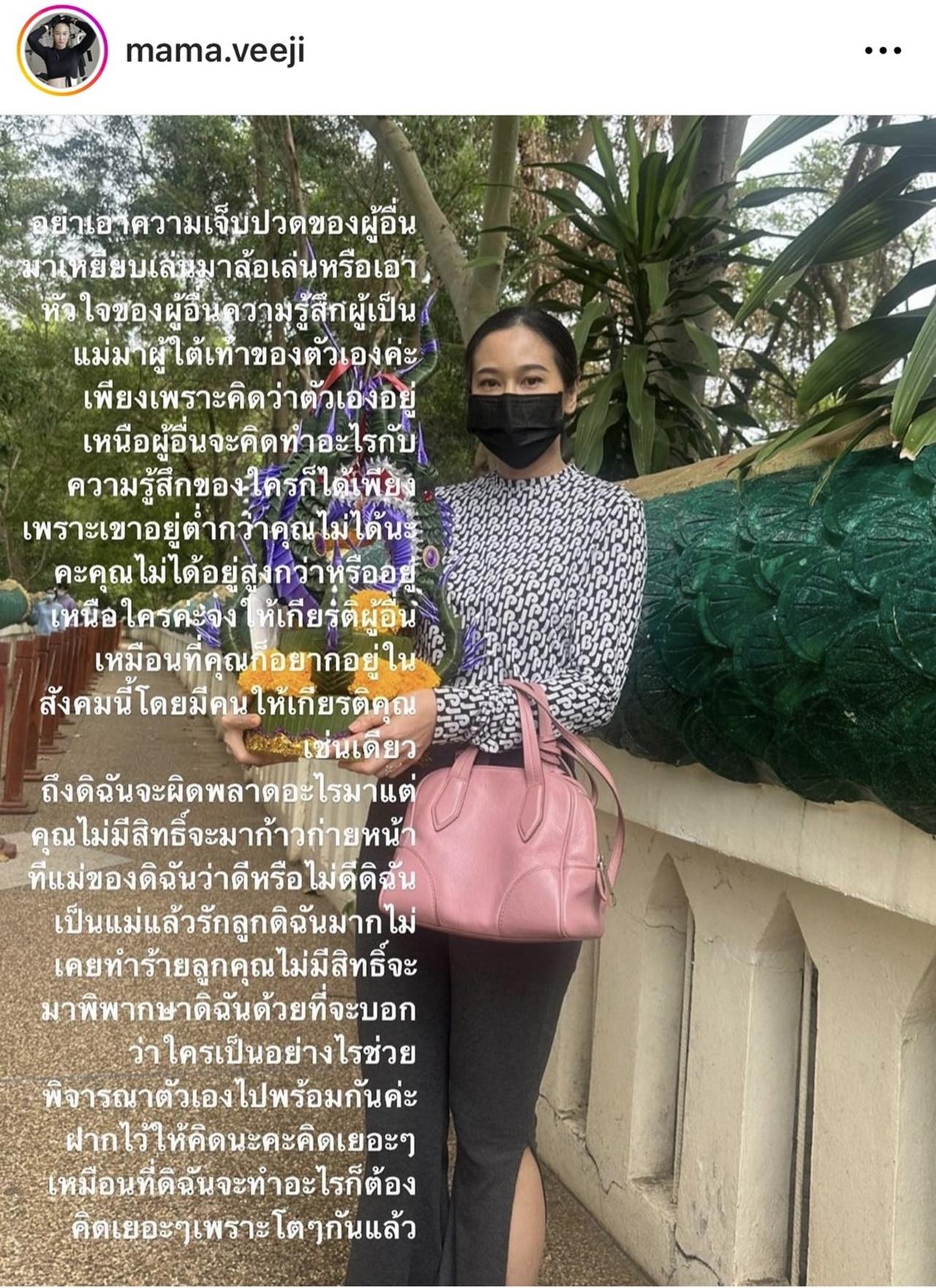และยังมีอีกข้อความที่เจ้าตัวเขียนเอาไว้ว่า "อย่าเอาความเจ็บปวดของผู้อื่นมาเหยียบเล่น มาล้อเล่น หรือเอาหัวใจของผู้อื่น ความรู้สึกผู้เป็นแม่มาผูกใต้เท้าของตัวเองค่ะ เพียงเพราะคิดว่าตัวเองอยู่เหนือผู้อื่น จะคิดจะทำอะไรกับความรู้สึกของใครก็ได้เพียงเพราะเขาอยู่ต่ำกว่าคุณไม่ได้นะคะ คุณไม่ได้อยู่สูงกว่าหรืออยู่เหนือใครค่ะ จงให้เกียรติผู้อื่นเหมือนที่คุณก็อยากอยู่ในสังคมนี้โดยมีคนให้เกียรติคุณเช่นเดียว ถึงดิฉันจะผิดพลาดอะไรมา แต่คุณไม่มีสิทธิ์จะมาก้าวก่ายหน้าที่แม่ของดิฉันว่าดีหรือไม่ดี ดิฉันเป็นแม่แล้วรักลูกดิฉันมาก ไม่เคยทำร้ายลูก คุณไม่มีสิทธิ์จะมาพิพากษาดิฉันด้วยที่จะบอกว่าใครเป็นอย่างไร ช่วยพิจารณาตัวเองไปพร้อมกันค่ะ ฝากไว้ให้คิดนะคะ คิดเยอะๆ เหมือนที่ดิฉันจะทำอะไรก็ต้องคิดเยอะๆ เพราะโตๆ กันแล้ว"