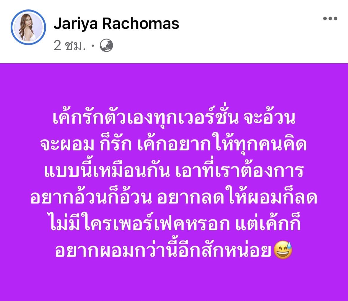 และล่าสุด ชีสเค้กลงข้อความในเฟซบุ๊ก โดยมีข้อความ “เค้กรักตัวเองทุกเวอร์ชั่น จะอ้วน จะผอม ก็รัก เค้กอยากให้ทุกคนคิดแบบนี้เหมือนกัน เอาที่เราต้องการ อยากอ้วนก็อ้วน อยากลดให้ผอมก็ลด ไม่มีใครเพอร์เฟคหรอก แต่เค้กก็อยากผอมกว่านี้อีกสักหน่อย”