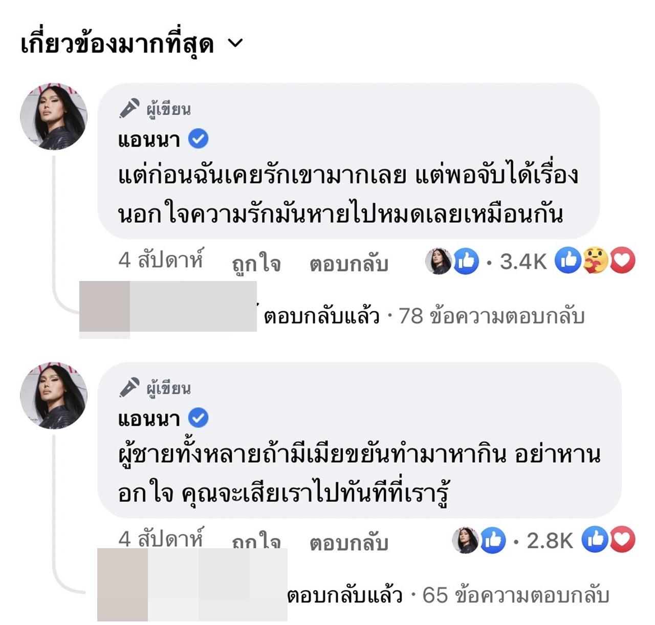 และแอนนายังคอมเมนต์ใต้โพสต์ของตัวเองว่า "แต่ก่อนฉันเคยรักเขามากเลย แต่พอจับได้เรื่องนอกใจความรักมันหายไปหมดเลยเหมือนกัน" และ "ผู้ชายทั้งหลายถ้ามีเมียขยันทำมาหากิน อย่าหานอกใจ คุณจะเสียเราไปทันทีที่เรารู้"