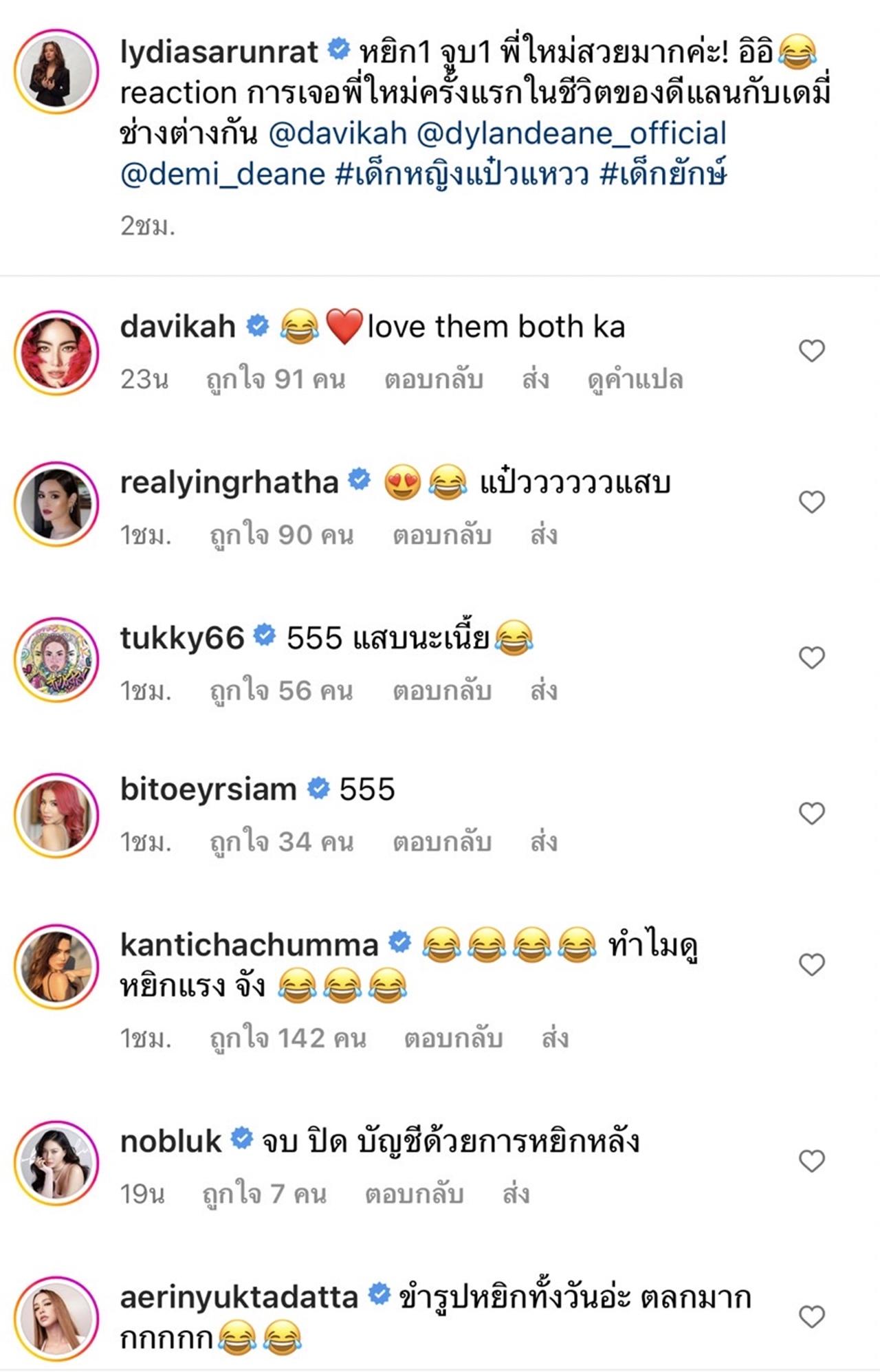 ล่าสุด แม่ลีเดีย ได้โพสต์ภาพเทียบรูปของ พี่ใหม่กับน้องดีแลน และ พี่ใหม่กับน้องเดมี่ พร้อมเขียนแคปชั่นว่า "หยิก1 จูบ1 พี่ใหม่สวยมากค่ะ! อิอิ reaction การเจอพี่ใหม่ครั้งแรกในชีวิตของดีแลนกับเดมี่ช่างต่างกัน @davikah @dylandeane_official @demi_deane #เด็กหญิงแป๋วแหวว #เด็กยักษ์"