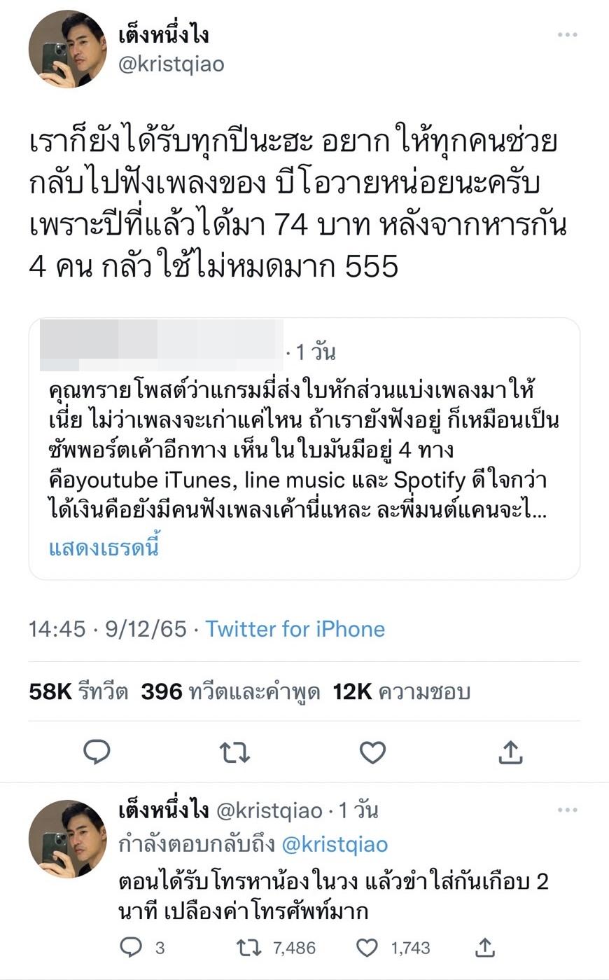 โดยในทวิตเตอร์ส่วนตัว @kristqiao เต็งหนึ่งได้ Quote Tweet ผู้ใช้ทวิตเตอร์รายหนึ่งที่พูดถึงเรื่องศิลปินกับส่วนแบ่งค่าลิขสิทธิ์เพลงจากค่ายแกรมมี่ พร้อมทั้งเขียนข้อความว่า “เราก็ยังได้รับทุกปีนะฮะ อยากให้ทุกคนช่วยกลับไปฟังเพลงของ บีโอวายหน่อยนะครับ เพราะปีที่แล้วได้มา 74 บาท หลังจากหารกัน 4 คน กลัวใช้ไม่หมดมาก 555” ก่อนจะทวีตข้อความเพิ่มเติมว่า “ตอนได้รับโทรหาน้องในวง แล้วขำใส่กันเกือบ 2 นาที เปลืองค่าโทรศัพท์มาก”