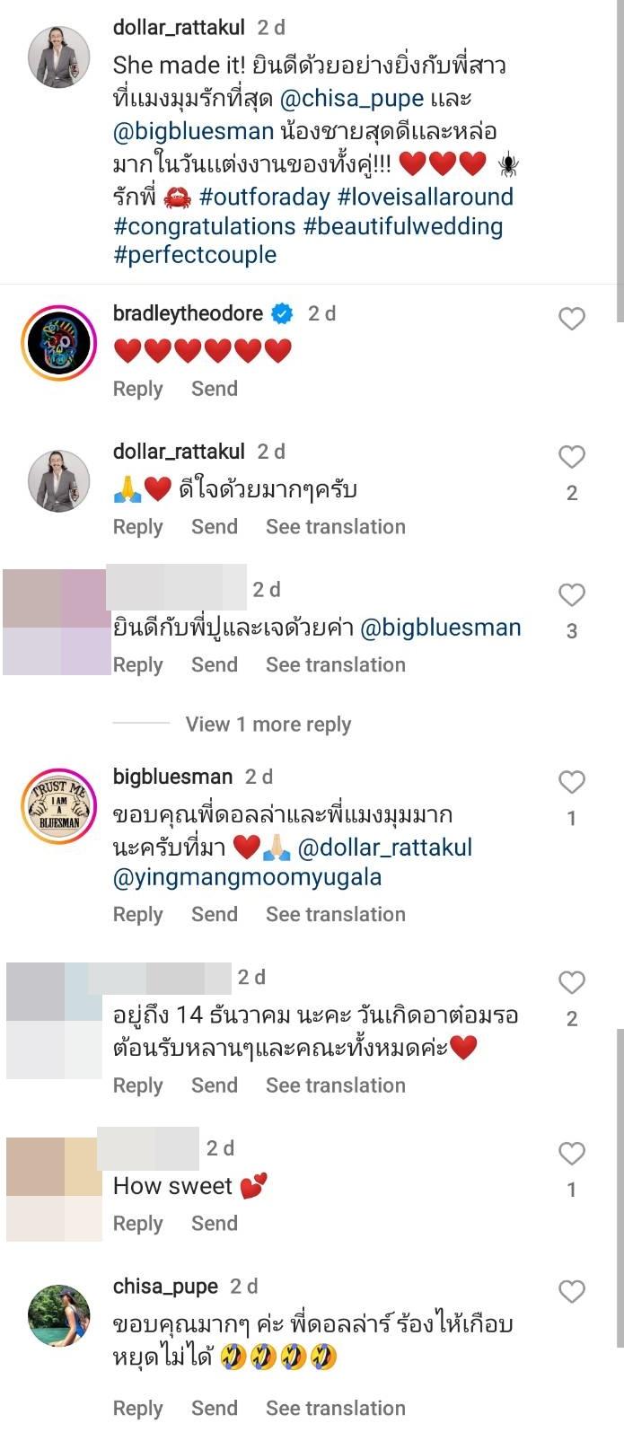 โดยมีแฟนๆ ชื่นชมในความสวยของคุณหญิงแมงมุม บ้างก็บอกว่าน่ารักมาก อีกทั้งยังอวยพรคู่บ่าวสาว ด้านเจ้าบ่าวก็เข้ามาคอมเมนต์ว่า “ขอบคุณพี่ดอลล่าและพี่แมงมุมมากนะครับที่มา” ส่วนเจ้าสาวก็บอกว่า “ขอบคุณมากๆ ค่ะ พี่ดอลล่าร์ ร้องไห้เกือบหยุดไม่ได้”.