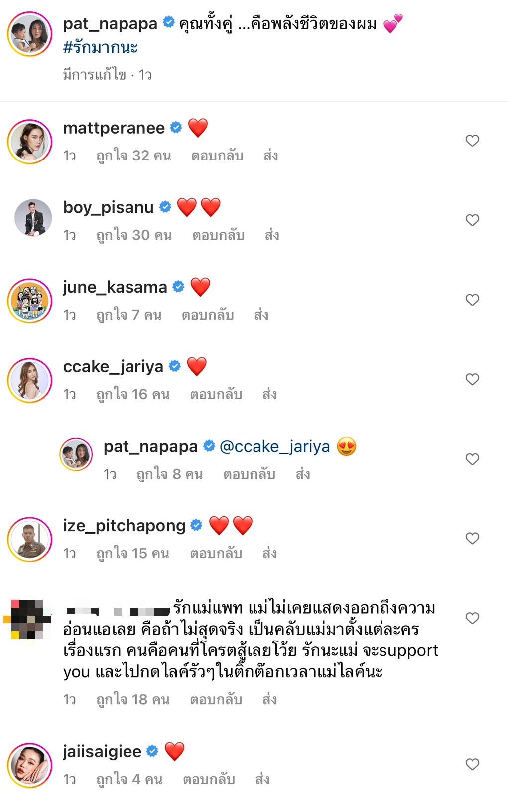 ภายหลังจากที่สาว แพท ได้เผยโมเมนต์ดังกล่าวออกไปแล้วนั้น บรรดาเพื่อนพ้องคนบันเทิงและแฟนคลับต่างได้เข้ามาคอมเมนต์ส่งกำลังใจกับคุณแม่คนเก่งกันอย่างล้นหลาม.