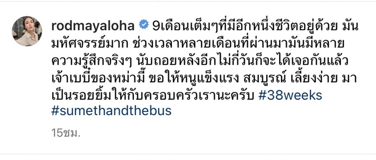 "9เดือนเต็มๆ ที่มีอีกหนึ่งชีวิตอยู่ด้วย มันมหัศจรรย์มาก ช่วงเวลาหลายเดือนที่ผ่านมามันมีหลายความรู้สึกจริงๆ นับถอยหลังอีกไม่กี่วันก็จะได้เจอกันแล้วเจ้าเบบี๋ของหม่ามี๊ ขอให้หนูแข็งแรง สมบูรณ์ เลี้ยงง่าย มาเป็นรอยยิ้มให้กับครอบครัวเรานะครับ #38weeks #sumethandthebus"
