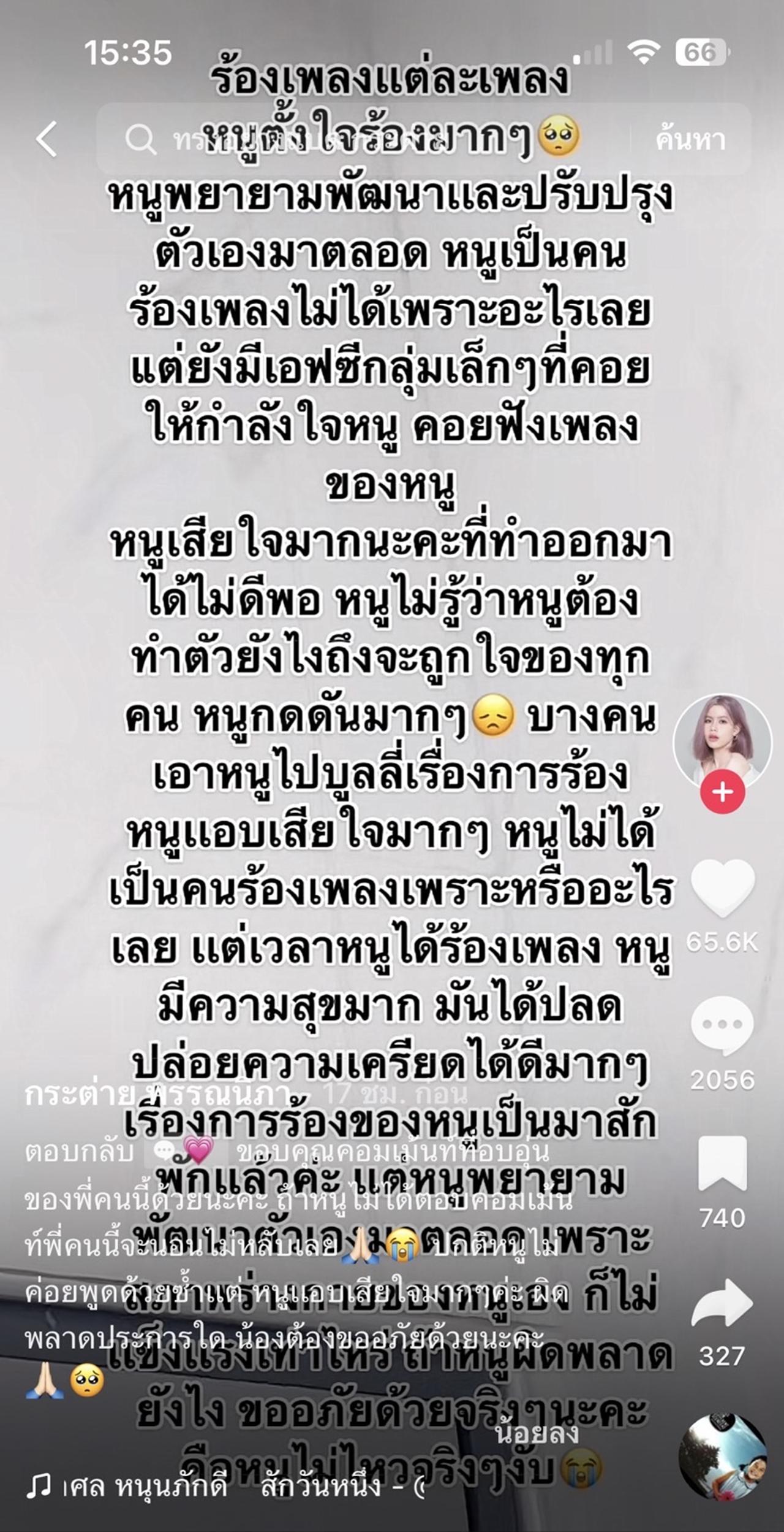 ซึ่งหนูเสียใจมากนะคะที่ทำออกมาได้ไม่ดีพอ หนูไม่รู้ว่าหนูต้องทำตัวยังไงถึงจะถูกใจของทุกคน หนูกดดันมากๆ บางคนเอาหนูไปบูลลี่เรื่องการร้องหนูแอบเสียใจมากๆ หนูไม่ได้เป็นคนร้องเพลงเพราะหรืออะไรเลย แต่เวลาหนูได้ร้องเพลง หนูมีความสุขมาก