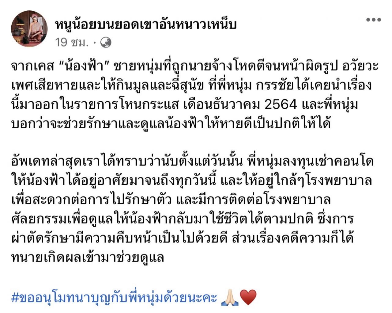 และมีการติดต่อโรงพยาบาลศัลยกรรมเพื่อดูแลให้น้องฟ้ากลับมาใช้ชีวิตได้ตามปกติ ซึ่งการผ่าตัดรักษามีความคืบหน้าเป็นไปด้วยดี ส่วนเรื่องคดีความก็ได้ทนายเกิดผลเข้ามาช่วยดูแล" ท่ามกลางเสียงชื่นชมจากชาวเน็ตที่เข้ามาคอมเมนต์ใต้โพสต์ดังกล่าวเป็นจำนวนมาก.