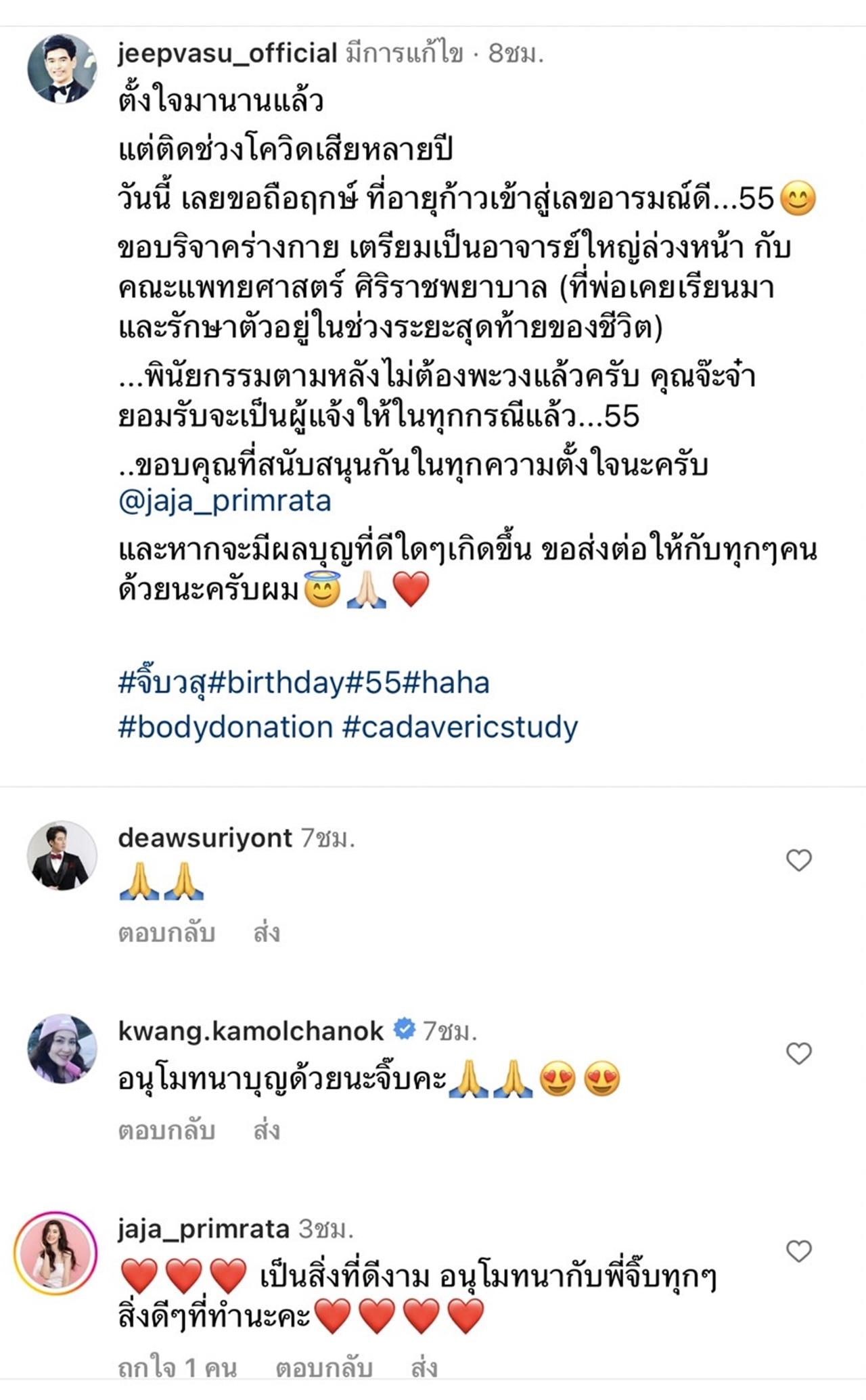"ตั้งใจมานานแล้ว แต่ติดช่วงโควิดเสียหลายปี วันนี้ เลยขอถือฤกษ์ ที่อายุก้าวเข้าสู่เลขอารมณ์ดี...55 ขอบริจาคร่างกาย เตรียมเป็นอาจารย์ใหญ่ล่วงหน้า กับคณะแพทยศาสตร์ ศิริราชพยาบาล (ที่พ่อเคยเรียนมา และรักษาตัวอยู่ในช่วงระยะสุดท้ายของชีวิต)